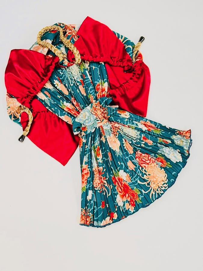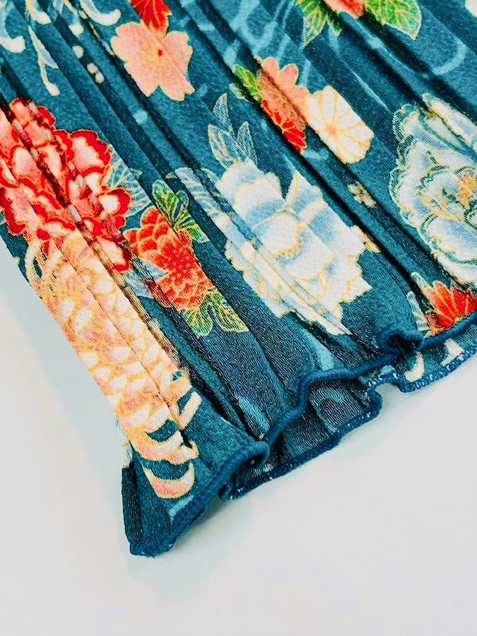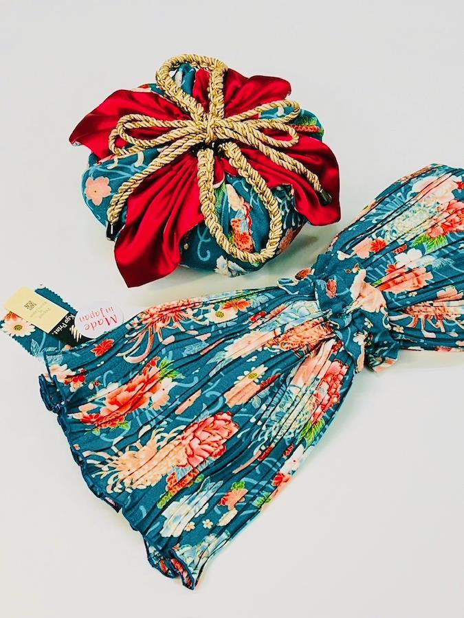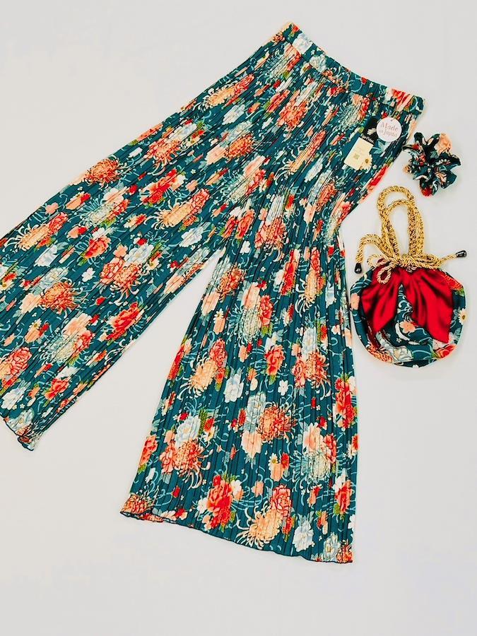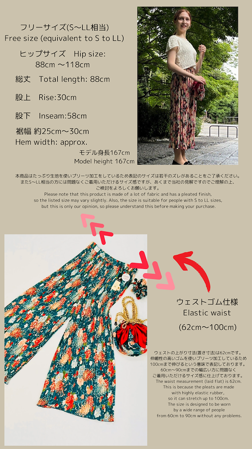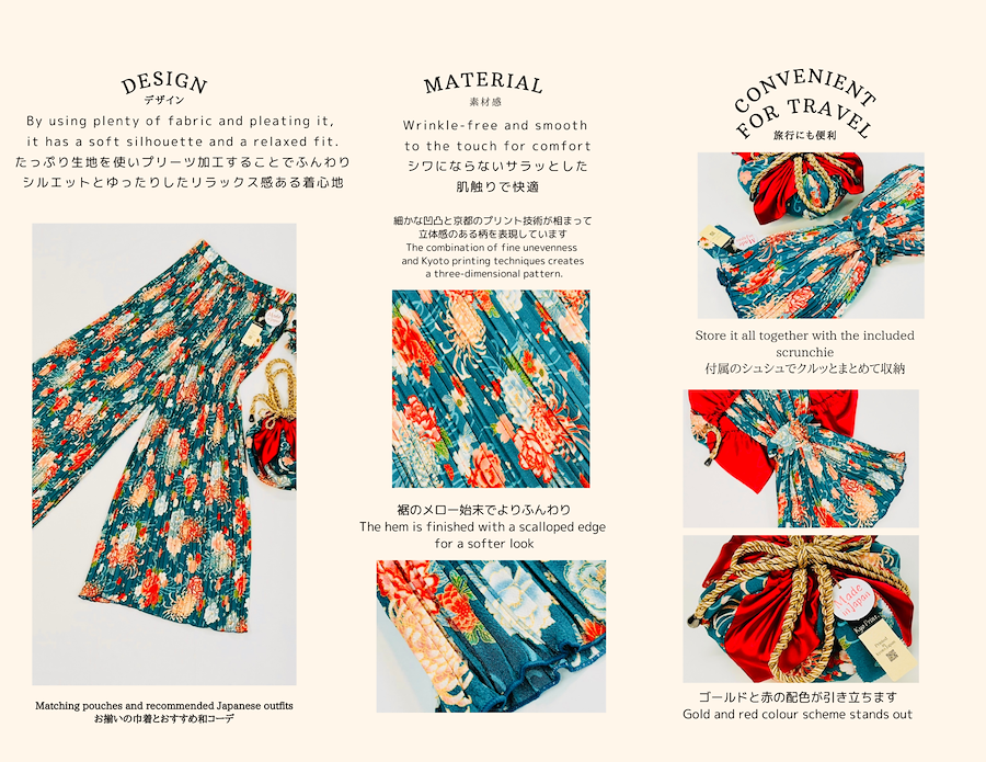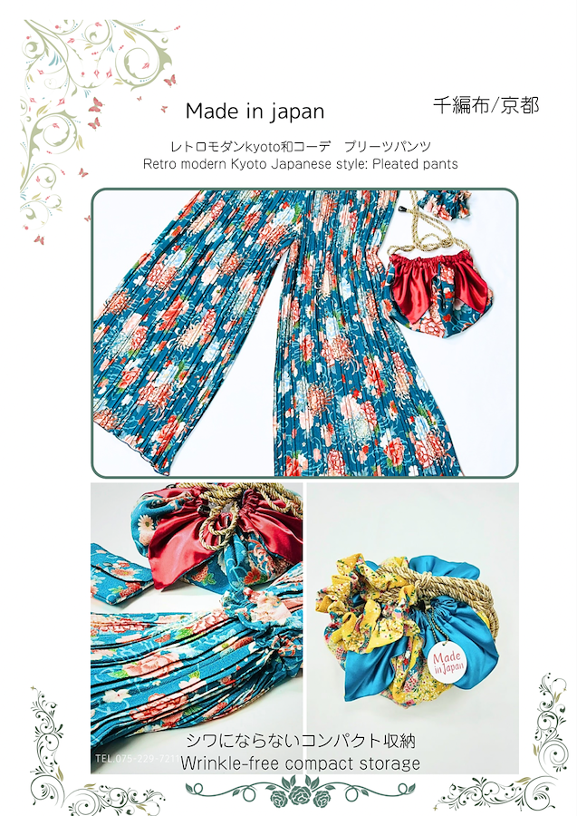 新作「レトロモダン和コーデkyoto」着物では味わえないリラックス感、レトロでモダンなプリーツパンツとお揃いのシュシュを巾着ポーチに入れてお届けする3点セットの新商品です。京都で染められた繊細で美しくカラフルなプリントを贅沢に使いプリーツ加工を組み合わせた素材から加工まで全て日本製のパンツです。アクセサリーとしても使えるお揃いのシュシュと巾着で和のコーデも楽しめます。またシワにならないのでご旅行の際はシュシュで束ねて巾着に収納。カバンの中で迷子にもならずに便利です。ウェストはよく伸びる総ゴム仕様でたっぷり生地を使いプリーツ加工しているためリラックス感のあるふんわりしたエレガントシルエットです。丈夫なポリエステル素材でご家庭で簡単にお洗濯していただけます。シュシュで束ねていただきますとプリーツの形状がより綺麗に保たれます。巾着も主役のプリーツパンツはサプライズなプレゼントとしてもおすすめです。<素材>ポリエステル 100% 日本製染色 京プリント<フリーサイズ>ウェスト 62cm~100cm(ゴム仕様)ヒップ 88cm~118Cm(プリーツ加工)総丈 88cm股上 30cm股下 58cm裾幅 25Cm~30cm(プリーツ加工)本商品はたっぷり生地を使いプリーツ加工しているため表記のサイズと若干のずれがあることをご了承ください。日本のS~LLぐらいの幅広い方にご着用いただけるサイズ感ですが、あくまで当方の見解ですのでご理解の上、ご検討をよろしくお願いいたします。