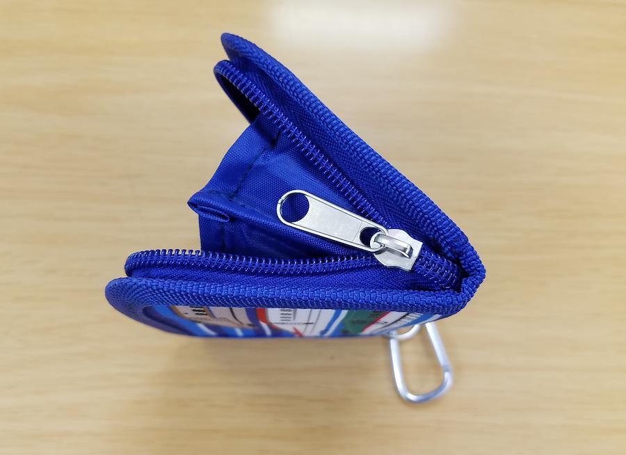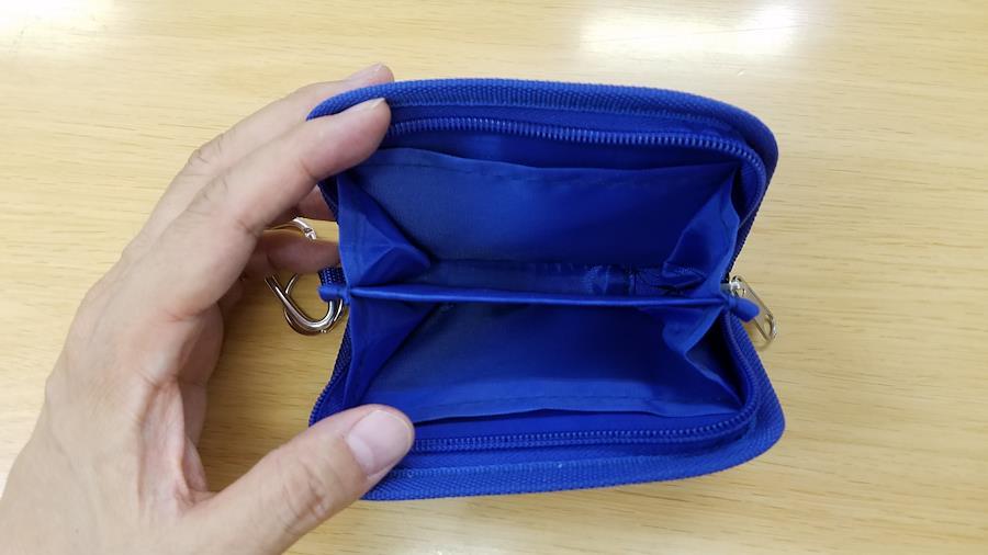 ■カラビナ付き、外側にパスケース付きチャックをあけて内側に小銭入れ2か所・カード入れ2か所あり