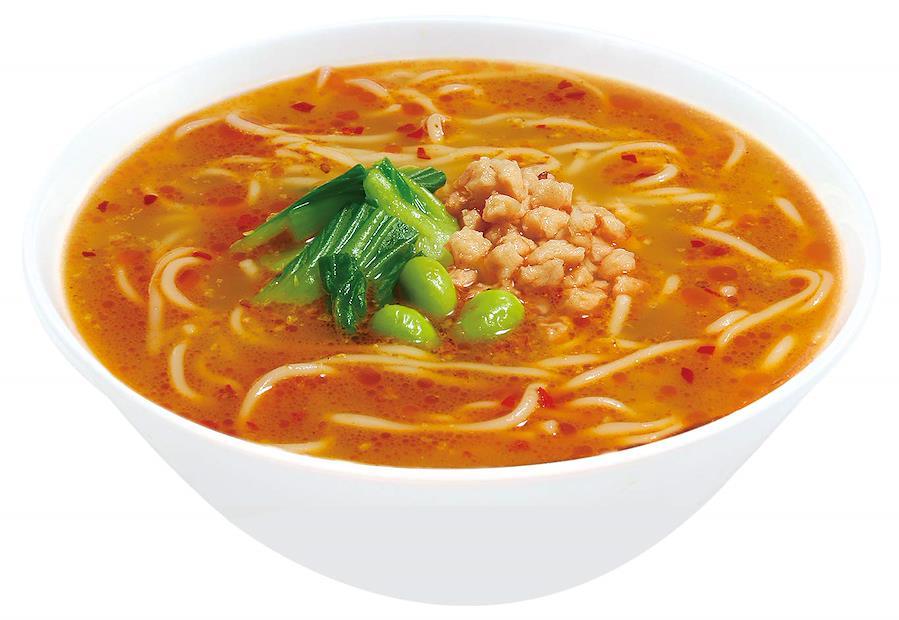 めん(小麦粉(国内製造)、食塩、大豆食物繊維)、スープ(ごま、食塩、糖類、植物油脂(なたね油、ごま油)、酵母エキス、豆板?、オニオンパウダー、香辛料、香味油、甜麺醤、たん白加水分解物、シイタケエキス)、かやく(粒状大豆たん白、チンゲンサイ、エダマメ、ごま、香辛料)/かんすい、増粘多糖類、カラメル色素、酸化防止剤(ビタミンE)、酸味料、トウガラシ色素、香辛料抽出物、(一部に小麦・ごま・大豆を含む)