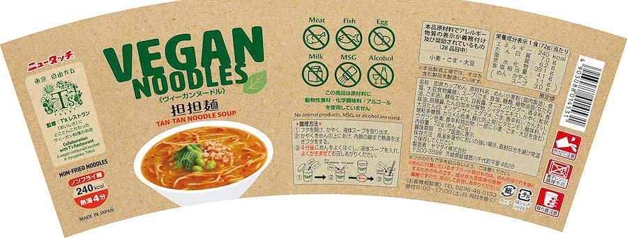 動物性食材をはじめ、化学調味料、アルコールを使用せずに作られた、ヴィーガンを始めとした多くの方々に食べて頂ける初のカップ麺。めんには、クチナシ色素を配合せず、小麦本来の色調を楽しめます。練りごまをベースに、豆板醤と甜麺醤を合わせ、花椒が香るまろやかな担担スープに仕上げました。1食当たり エネルギー:240kcal、たんぱく質:7.0g、脂質:6.2g、炭水化物:39.1g、食塩相当量:4.1g