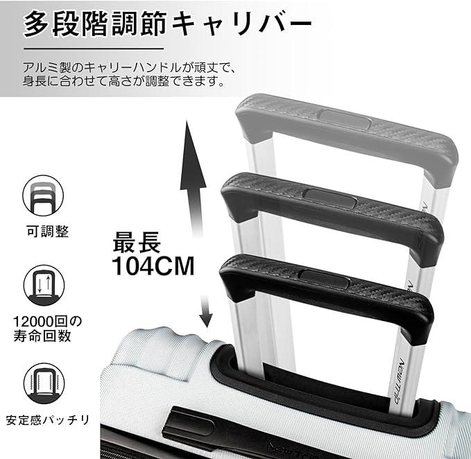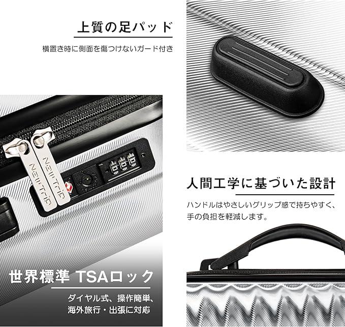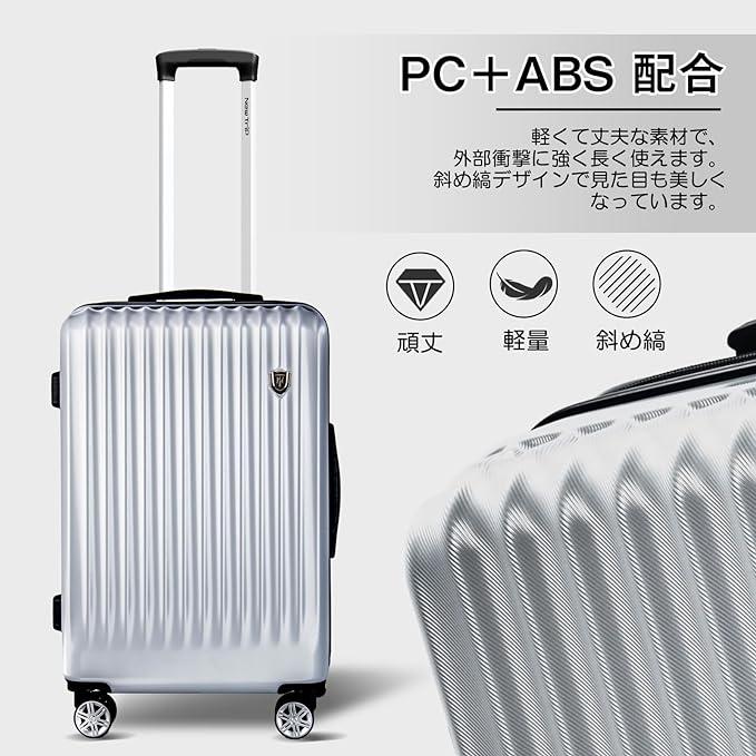 ?【表地】: PC(ポリカーボネート)+ABS樹脂、機内持ち込みOK (Sサイズ):54.5x36x22cm、三辺の和は112.5cm、容量は約40L、重量は約2.8kgです。超軽量で、女性でも楽々に持ち出かける人気なキャリーケースです。 【高品質なボディ&信頼のYKKファスナー】ボディは耐久性や耐衝撃性に優れるABS+PC樹脂の高品質素材。ABS樹脂は軽くて弾力性と割れに強く、PC(ポリカーボネート)樹脂は耐衝撃性・断熱材に優れる、両素材を混合した耐久性が高いハードタイプの高品質ボディを実現しています。また、日本が世界に誇るYKKファスナーをメインファスナーに標準装備。ファスナータイプのスーツケースによくあるファスナーの不具合(ファスナー脱線や開き)を解消し、長期にわたり安定した使用感が可能となりました。 【多段調節キャリバー&静音360度回転キャスター】アルミ合金製の超軽量のキャリバーは伸縮可能で、ご自分の身長に合わせて、最適な高さに調節できます。360度回転8輪ダブルキャスター搭載、静音設計と耐久性抜群のキャスターで、凸凹路面で、重い荷物でもスムーズで安定した走りを可能に。 【合理的な仕切りデザイン&安心のTSAロック】密閉されたU字型コンパートメントのおかげで、荷物を入れるとばらばらになりません。メッシュ状のポケットにも付き、入れ物は一目でわかります。後シェルは固定バンド装備して、荷物崩れを防着ます。収納力抜群、たくさんの小物を入れることはできます。世界基準のTSAロック搭載。アメリカ空港(グアム、ハワイ、サイパン含む)では必需品。信頼のTSA職員と本人しか開けることができません。、ダイヤル式ロックなので、鍵をなくす心配もありません。 【あんしん1年間保証】通常使用で1年以内に不具合が発生した場合、無料で修理また交換させていただきます。万が一、初期不良があった場合は迅速に新品交換させていただきます。