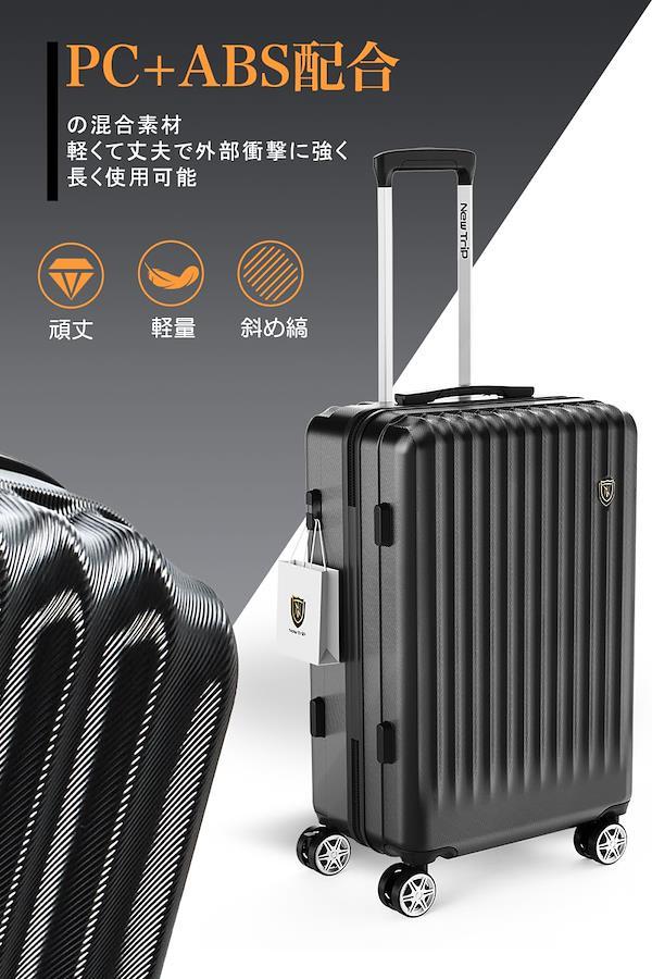 ??【高品質なボディ&信頼のYKKファスナー】ABS樹脂は軽くて弾力性と割れに強く、PC(ポリカーボネート)樹脂は耐衝撃性・断熱材に優れる、両素材を混合した耐久性が高いハードタイプの高品質ボディを実現しています。また、日本が世界に誇るYKKファスナーをメインファスナーに標準装備。ファスナータイプのスーツケースによくあるファスナーの不具合(ファスナー脱線や開き)を解消し、長期にわたり安定した使用感が可能となりました。 ??【ストッパー付き静音ダブルキャスター&物掛けフック】360度回転可能の8輪ダブルキャスターは、静音と耐久性抜群で、凸凹道でもスムーズに走ることができます。また、ストッパーが付いているため、坂道や電車内などスーツケースを止めたい時に便利です。キャリーケースのボディ側面に手提げ袋など掛けられるフックを搭載しています。外出中増えがちな荷物を、手持ちから解放してくれる便利機能です。 ??【多段調節キャリバー&握りやすい2層ハンドル】アルミ合金製の超軽量のキャリバーは伸縮可能で、ご自分の身長に合わせて、最適な高さに調節できます。2層式で設計されたハンドルは、手に当たる部分に柔らかい素材を使用しており、荷物を入れた状態でも手に食い込みにくく長時間持っていても手が痛くなりにくいのが特徴です。 ??【合理的な仕切りデザイン&安心のTSAロック】密閉されたU字型コンパートメントのおかげで、荷物を入れてもばらばらになりません。メッシュ状のポケット付きで、入れた物が一目でわかります。固定バンドを装備し、荷物崩れを防止します。また、世界基準のTSAロック搭載しています。アメリカ空港(グアム・ハワイ・サイパン含む)では必需品です。ダイヤル式ロックなので鍵を無くす心配がないのも魅力です。 ??【安心の日本ブランド&1年間保証】New Tripはあらゆるシーンで安心してご利用いただける日本のスーツケースブランドです。高品質にこだわり、アフターサービスにも対応しています。通常使用で1年以内に不具合が発生した場合、無料で修理また交換させていただきます。万が一、初期不良があった場合は迅速に新品交換させていただきます。