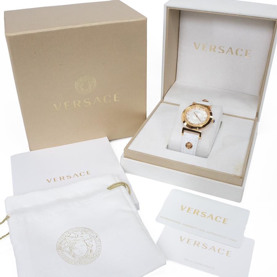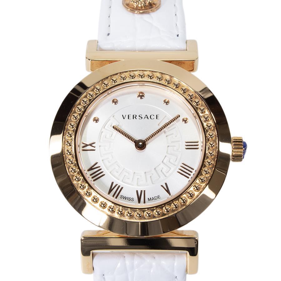 こちらは純白のレザーベルトが腕元を清楚に飾ります、ヴェルサーチェの腕時計でございます。