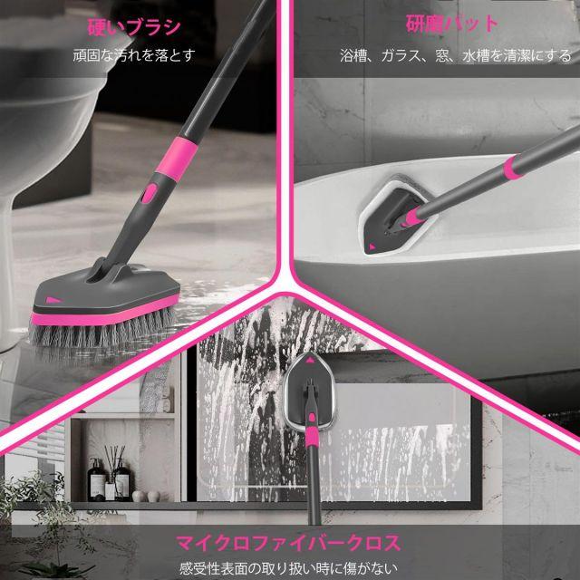 4つの交換可能なブラシヘッド:玄関タイルブラシには4つのクリーニングブラシヘッドが付属しています。マイクロファイバークロスは、繊細な表面の汚れを処理します、研磨パットはバスタブやシンクを、硬いブラシは頑固な汚れを落とす。