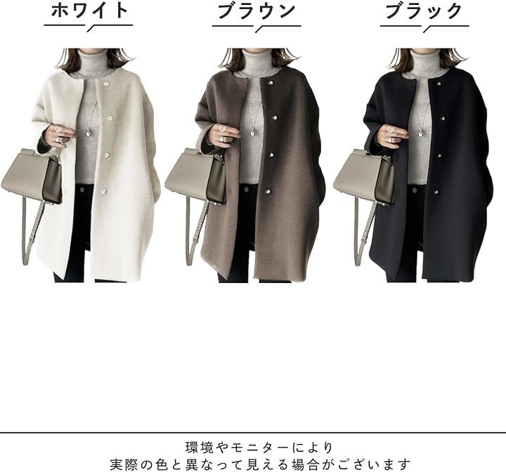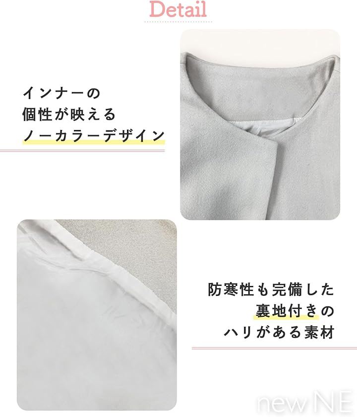 「インナーを際立たせるノーカラーデザイン」ノーカラーのコートは飾り襟のブラウスやフーディと組み合わせると、インナーの個性が引き立ってよりお洒落に仕上がります。