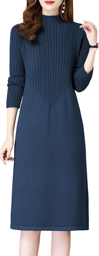 Newne Knit Dress for Women, Cable Knit, Midi Length, Solid Color, Simple, Elegant, For Commuting, Autumn, Winter, Large Size, Loose Fit, Long Sleeves, High Neck, Figure-Hugging, Thick, Turtleneck, Rib Knit, 4A-W18-NVL