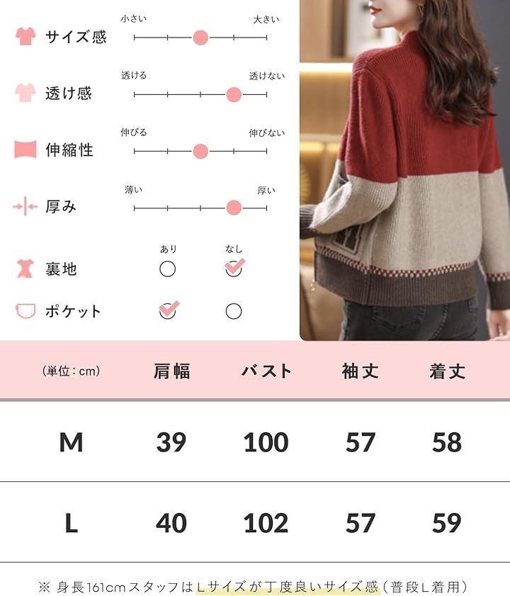 サイズ:肩幅/バスト/袖丈/着丈 「M」39/100/57/58 「L」40/102/57/59