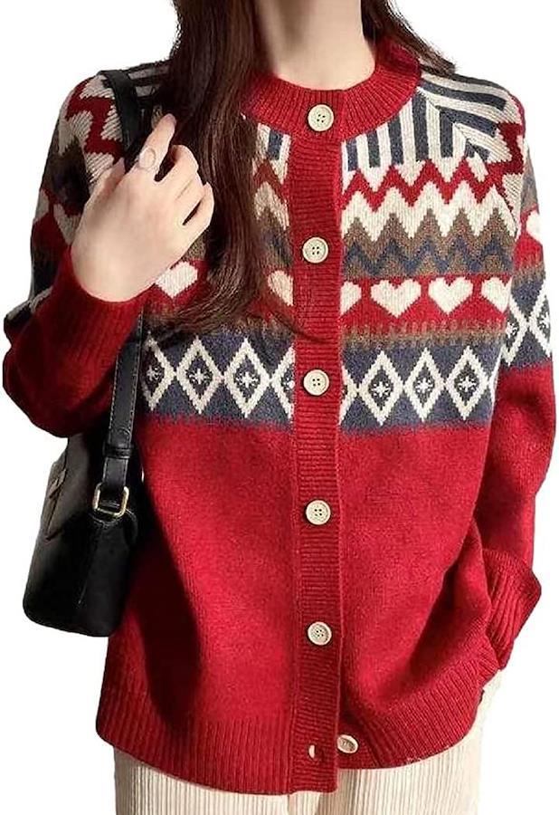 柄ニットでヴィンテージ感*柄ニットでヴィンテージ感とルーズなフィットでレイヤードにぴったりのアイテムです:優しいデザインでノルディック柄は冬を感じさせてくれて、カラー配色や質感がきれいなカーディガン。