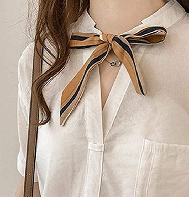 ストライプのタイがポイントでタイにしたり、りぼんに結んだり。