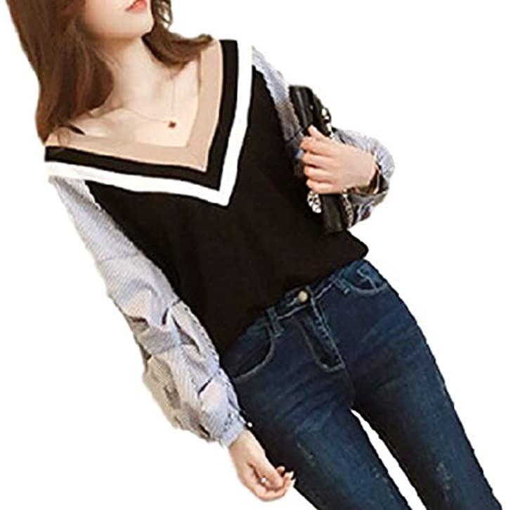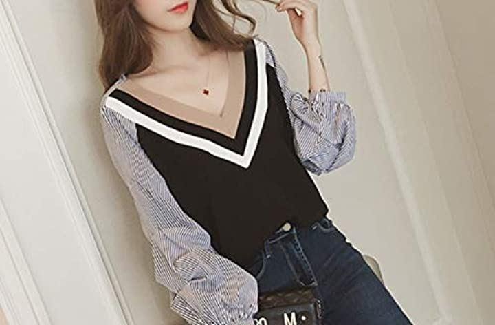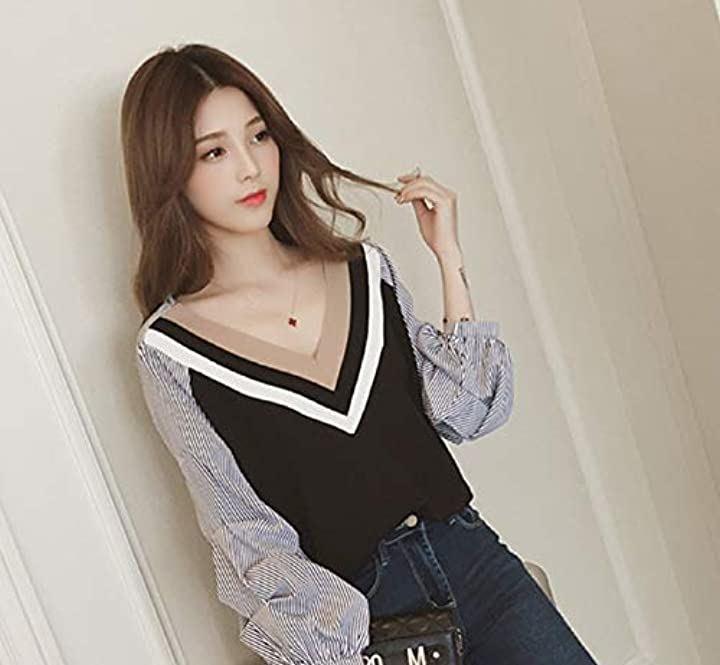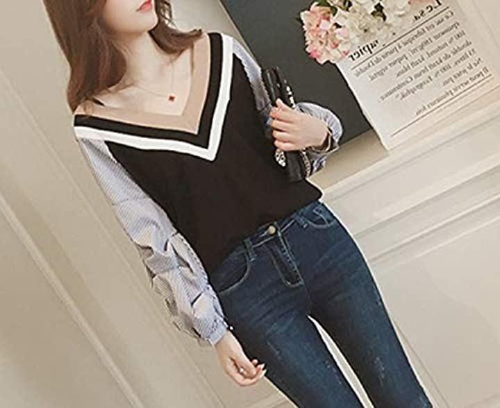 Nibunnoichi Style T-shirt, large size, women's, cute, loose fit, pullover, streetwear, sweatshirt, long sleeve, v-neck, top, elegant, black, L