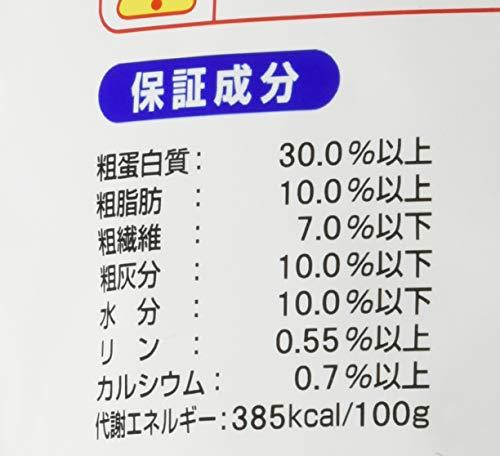 チキンミール、とうもろこし、小麦粉、グルテンミール、おからミール、動物性油脂、セルロース、ビール酵母、ビートパルプ、大豆オイル、海藻粉末、タンパク質分解酵素、タウリン、ビタミンE、米糠発酵物、耐熱性ビタミンC、ビタミン混合、ミネラル混合