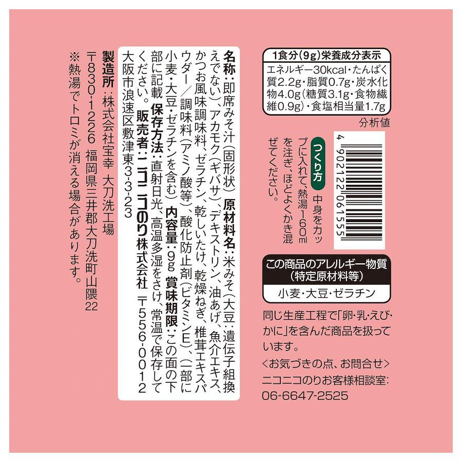 原材料:米みそ(大豆は遺伝子組換えでない)、アカモク(ギバサ)、デキストリン、油あげ、魚介エキス、かつお風味調味料、ゼラチン、椎茸、ねぎ、椎茸エキス、調味料(アミノ酸等)、酸化防止剤(ビタミンE)、(原材料の一部に小麦を含む)