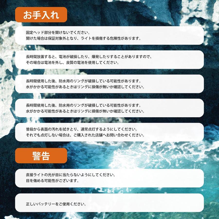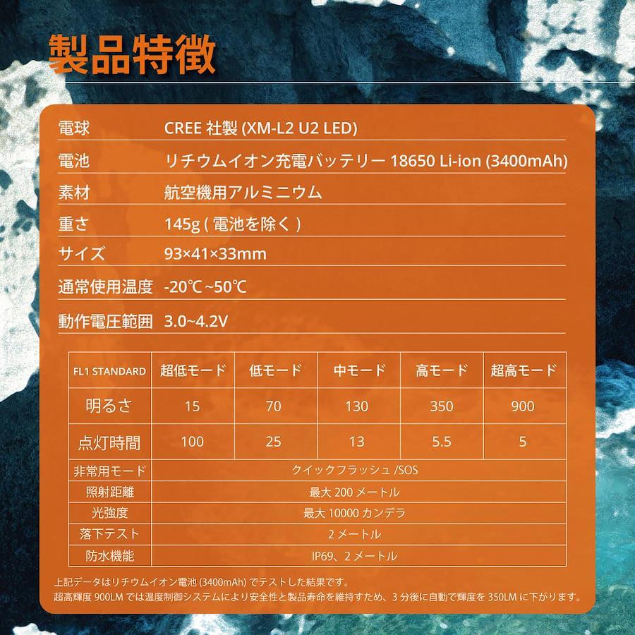 明るさ: 900&350&130&70&15LM最大照射距離: 200m点灯時間: 900LM時: 5時間/350LM時: 5.5時間/130LM時: 13時間/70LM時: 25時間/15LM時: 100時間光強度: 10000cdバッテリー: 18650リチウムイオン電池(3400mah)防水機能: IP68+0.2気圧防水機能落下耐久高さ: 2mLEDメーカー: CREE社首振角度: 160°