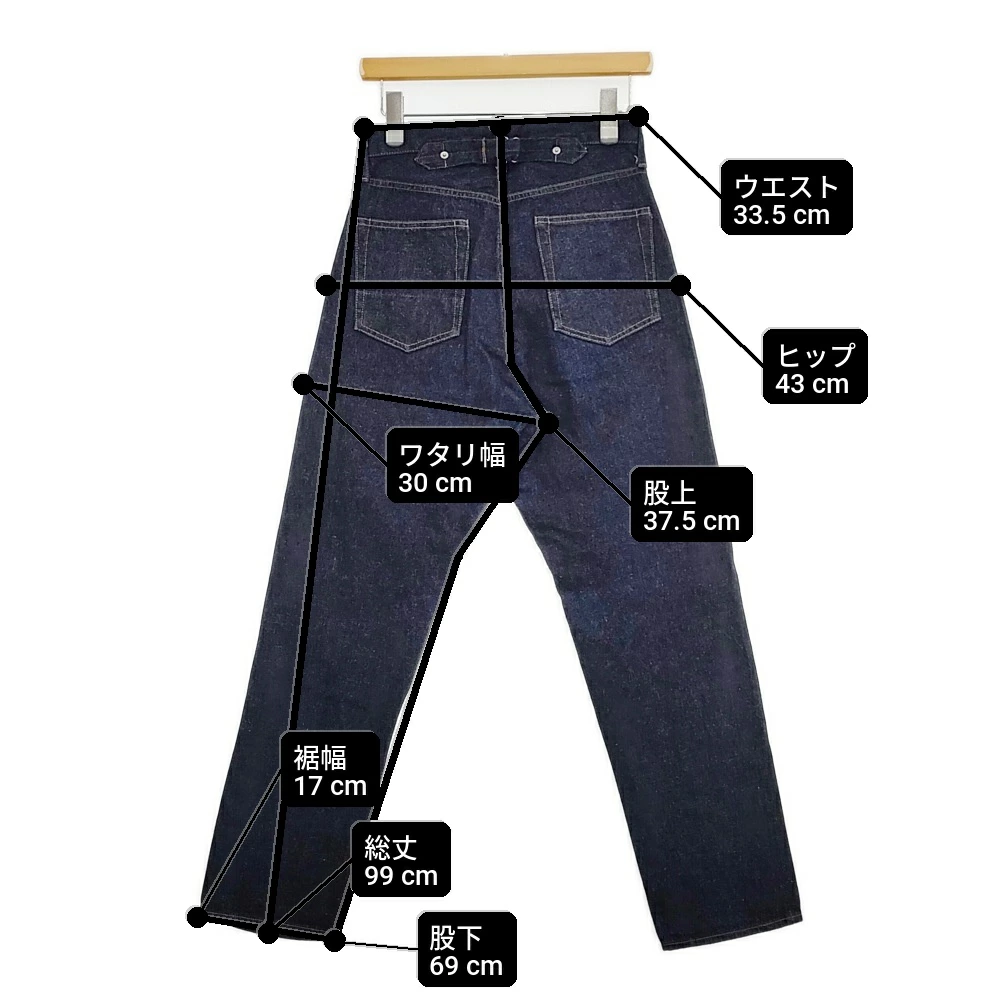 | 実寸サイズ | 総丈:約99cm ウエスト:約33.5cm 股上:約37.5cm 股下:約69cm ヒップ:約43cm ワタリ幅:約30cm 裾幅:約17cm ※採寸画像がある商品はハンガーに吊るした状態での計測のため、平置きでの採寸とは差が生じる場合がございます。平置きでの実寸サイズをご希望の場合は、ご購入前に必ずご質問ください。 ※記載以外のサイズが合わないことを理由とした返品はできませんので、 記載部分以外で実寸サイズの気になる箇所があれば必ず購入前にご質問ください。 |