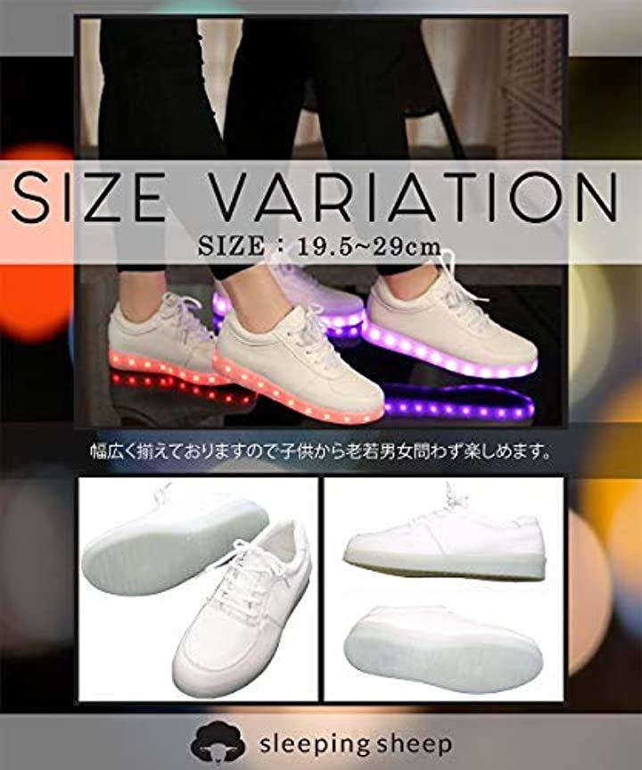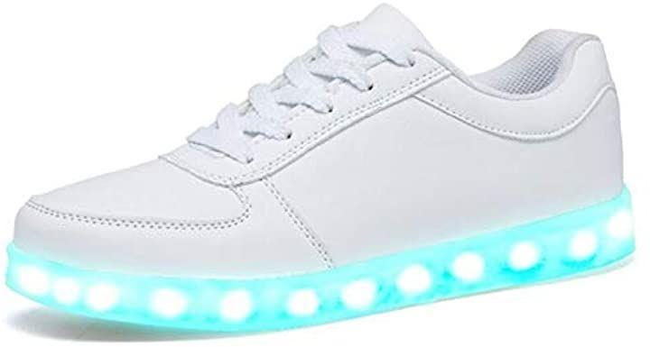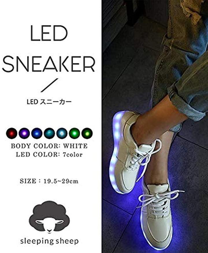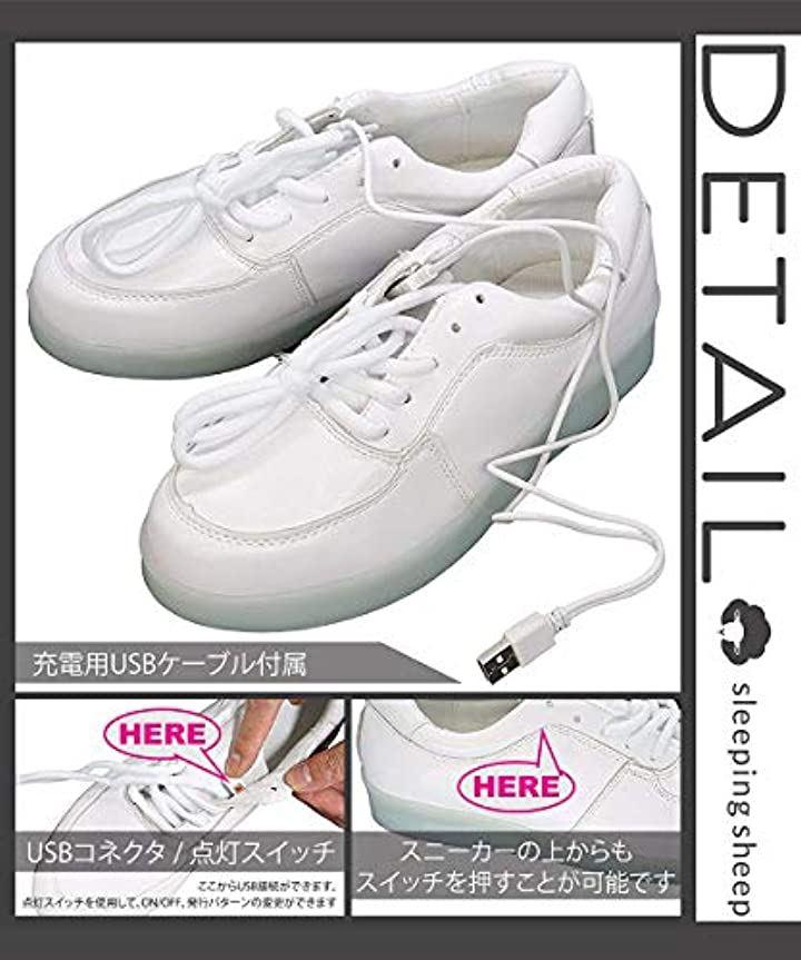 スニーカー内蔵のボタン(USB裏部分)を押すことで靴底のLEDライトが7色の発光パターンとレインボーに光ったり、フラッシュしたり4パターンの光り方でかなり目立つスニーカーです。
