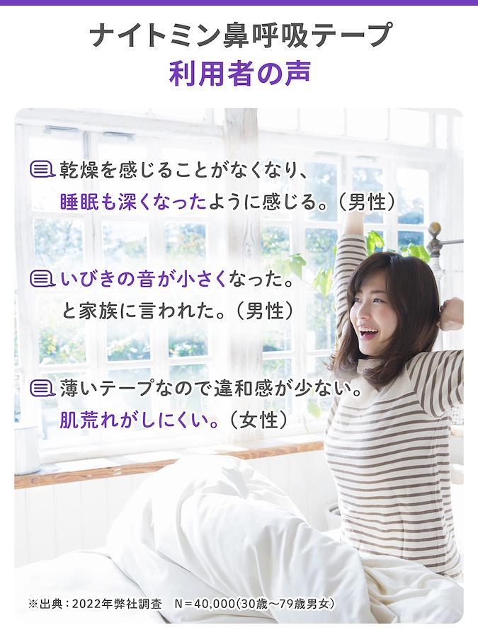 ●鼻呼吸に誘導し、口・喉の乾き、いびき音を軽減、安眠※へ促します