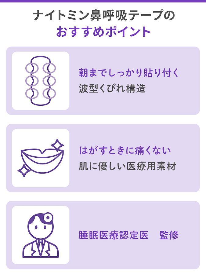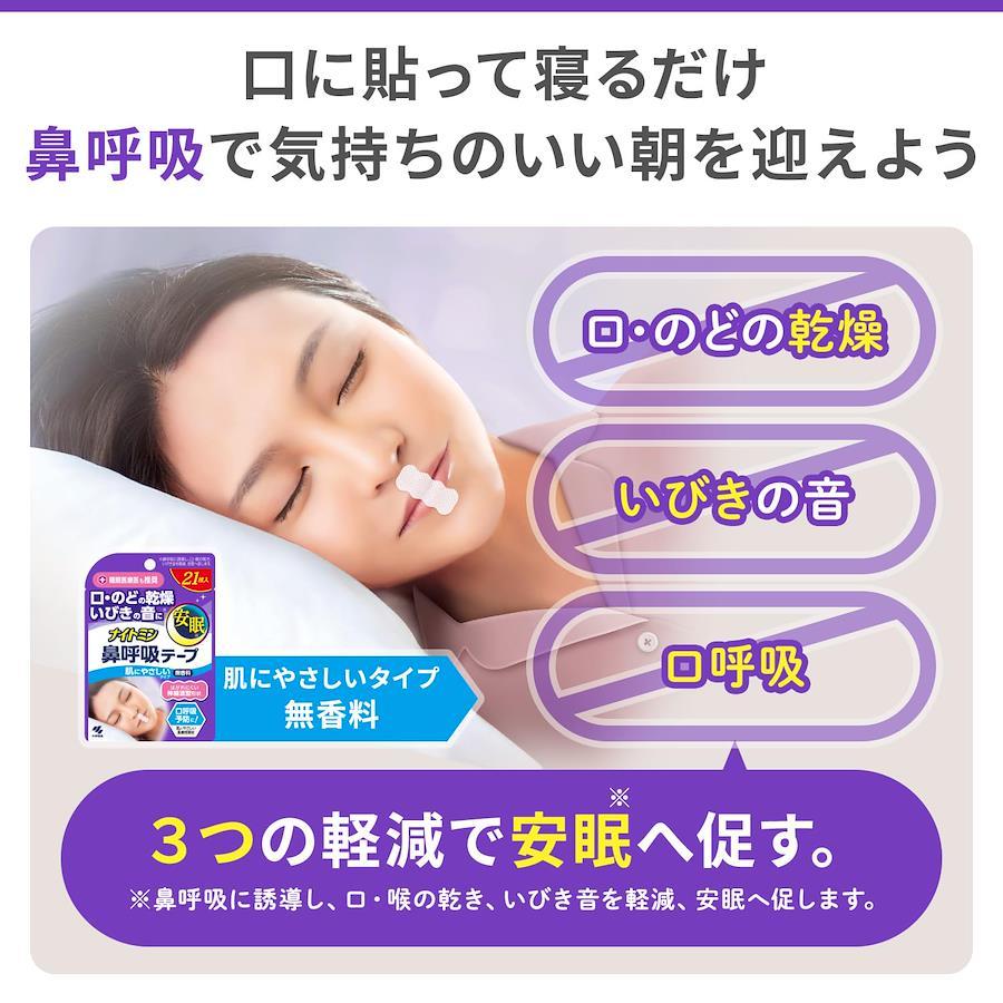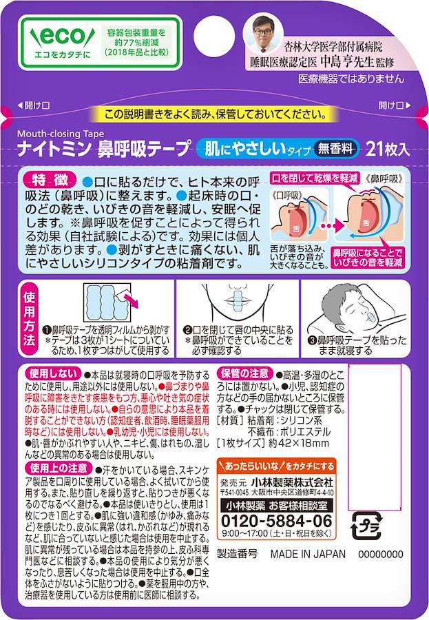 ●はがれにくい伸縮波型形状 口に貼るだけで、ヒト本来の呼吸法(鼻呼吸)に整える鼻呼吸テープ 肌にやさしいタイプ 商品サイズ (高さ×奥行×幅): 2mm×90mm×130mm ブラント名: ナイトミン メーカー名: 小林製薬