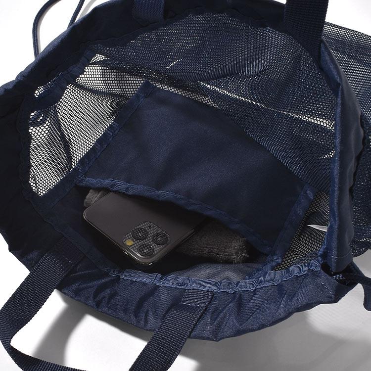 【メッシュドローストリングプールバッグ】ナップザックタイプのメッシュプールバッグ。軽くて持ち運びに便利!手提げストラップとショルダーストラップのどちらも付属しており、持ち方の自由度が高いプールバッグです。水着・タオル・着替え類一式はもちろん、A4サイズまで収納できる10Lサイズ。通勤・通学や旅行用サブバッグとしてもオススメ◎