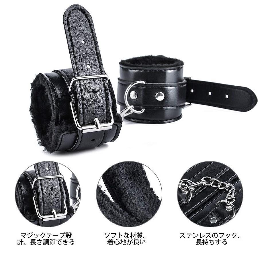 【豪華なセット】足枷、手枷、アイマスクの上品な3点セットです。数種の道具を最適化して、プレイを思う存分体験できます。マンネリと退屈を切り捨て、いつもと違う刺激で、夫婦のマンネリを解消しましょう 【手枷&足枷】両手を拘束すると男性でも外せません。内側がソフトな触り心地で、肌に優しいです。自由性溢れたリングフックはいろんな組み合わせができます。ベッドやテーブルや椅子などのところによって、使い方が変わります。身動きが取れずにパートナーとの羞恥プレイが楽しめます 【アイマクス付き】肌触りの優しいアイマスクはふわふわのクッションが入っているので、目元への触感はとてもソフト、不適感や痛みを与えません。視覚だけを奪って、闇の中で何が発生するかさっぱり分かりません 【調節可能】レベルに複数の孔が付いていますから、調節可能です。自分のサイズによって調節します。緩みを調節できますから、体格が大きい男女も使えます。それとも、男性の両手を縛ったほうが面白いかもしれません 【高級な素材】高級なステンレス、綿とPUを採用して、耐久性が強いです。内側に付いたのはふわふわした毛皮です。見た目も素敵ですし、触り心地もとてもソフトです。多少の厚さがありますから、きつく縛られても肌に損傷を与えません