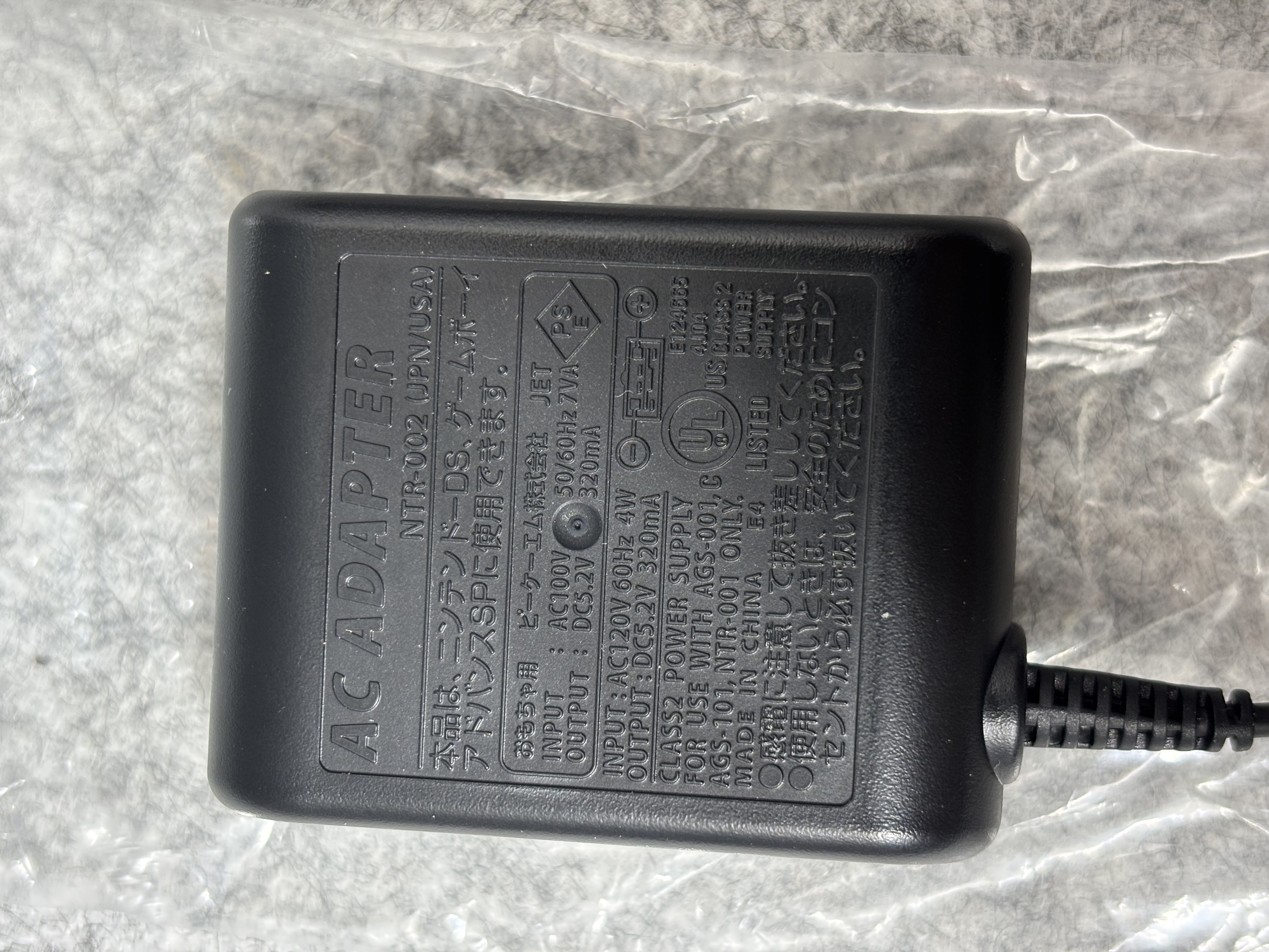- モデル: NTR-002 UEN (USA)- 出力: 5.2V 320mA- 入力: AC 100-240V 50/60Hz 0.4W- 注意事項: 非修理可能、乾燥した場所で使用- ブランド: Nintendo
