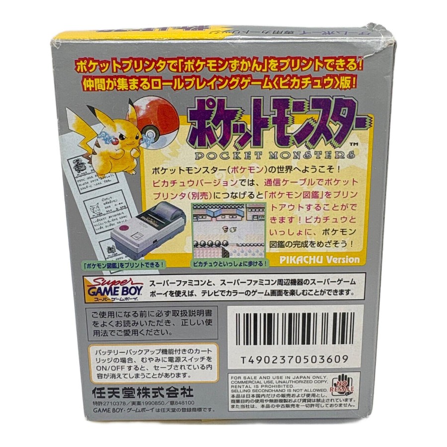 ■商品状態程度C:劣化やダメージなどがあるお品物こちらの商品はキズやヨゴレ、劣化などが見受けられます。また店頭にて展示販売を行っている為、記載に無いキズ、ヨゴレ、劣化などが見受けられる場合がございます。■商品説明メーカー: 任天堂商品名 : ポケットモンスター ピカチュウ型番 : DMG-APSI-JPN発売年 : 1998年JANコード: 4902370503616ジャンル : ロールプレイングゲーム (RPG)■付属品箱・取説付■その他必ず、商品注文される前に店舗情報に記載している注意事項をご確認ください。
