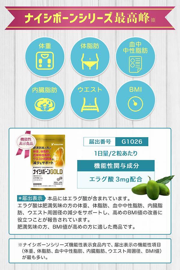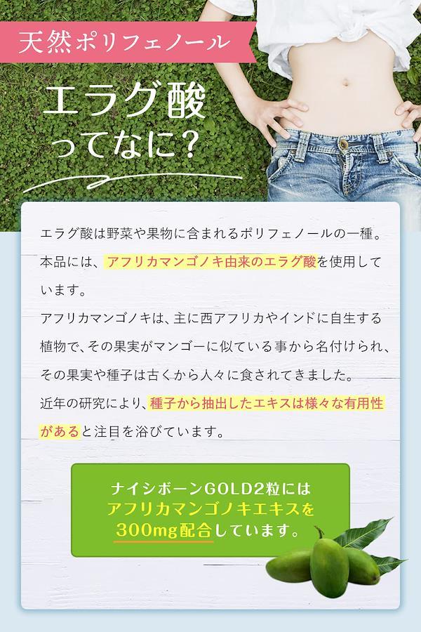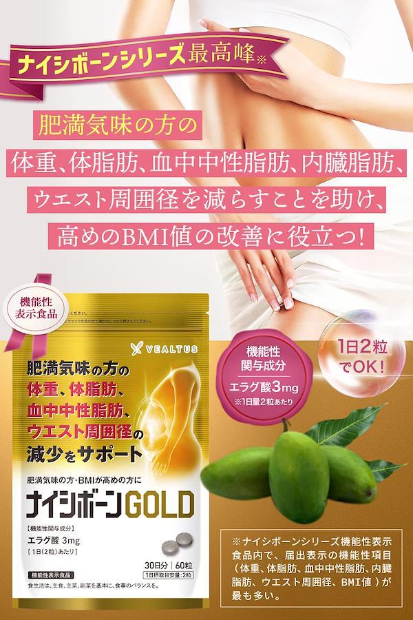 ナイシボーンシリーズ最高峰(※) 肥満気味の方の体重、体脂肪、血中中性脂肪、内臓脂肪、ウエスト周囲径の減少をサポート!(※ナイシボーンシリーズの中で届出表示機能性項目が最も多い。) 【機能性表示食品】届出表示:本品にはエラグ酸が含まれています。エラグ酸は肥満気味の方の体重、体脂肪、血中中性脂肪、内臓脂肪、ウエスト周囲径の減少をサポートし、高めのBMI値の改善に役立つことが報告されています。肥満気味の方、BMI値が高めの方に適した商品です。【届出番号】G1026 【4種のサポート成分を厳選配合】「白いんげん豆」「ニームリーフ」「アカショウマ」「バナバ」 【こだわりの無添加】香料、保存料、着色料、光沢剤は一切使用していません。【製造のこだわり】徹底的に管理された日本国内の製薬会社で製造しています。品質試験に合格した商品のみ皆様にお届けしております。 【お召し上がり方】1日2粒を目安に、水又は白湯と一緒に噛まずにお召し上がりください。(1袋60粒入り 30日分)
