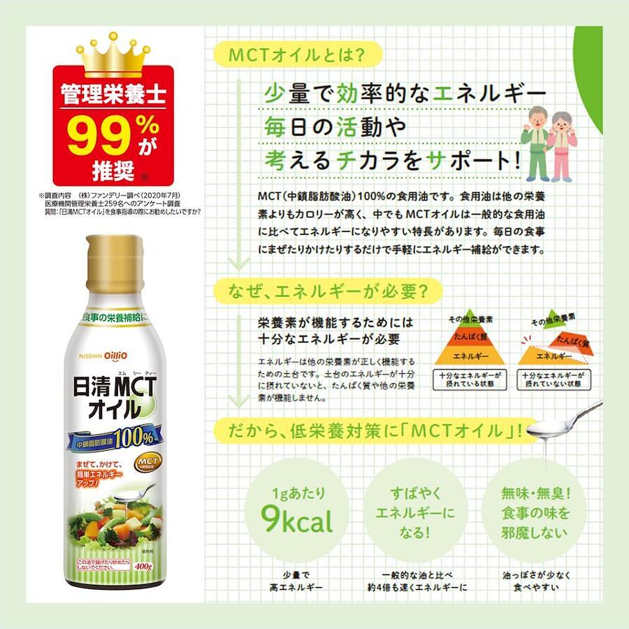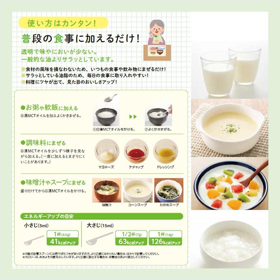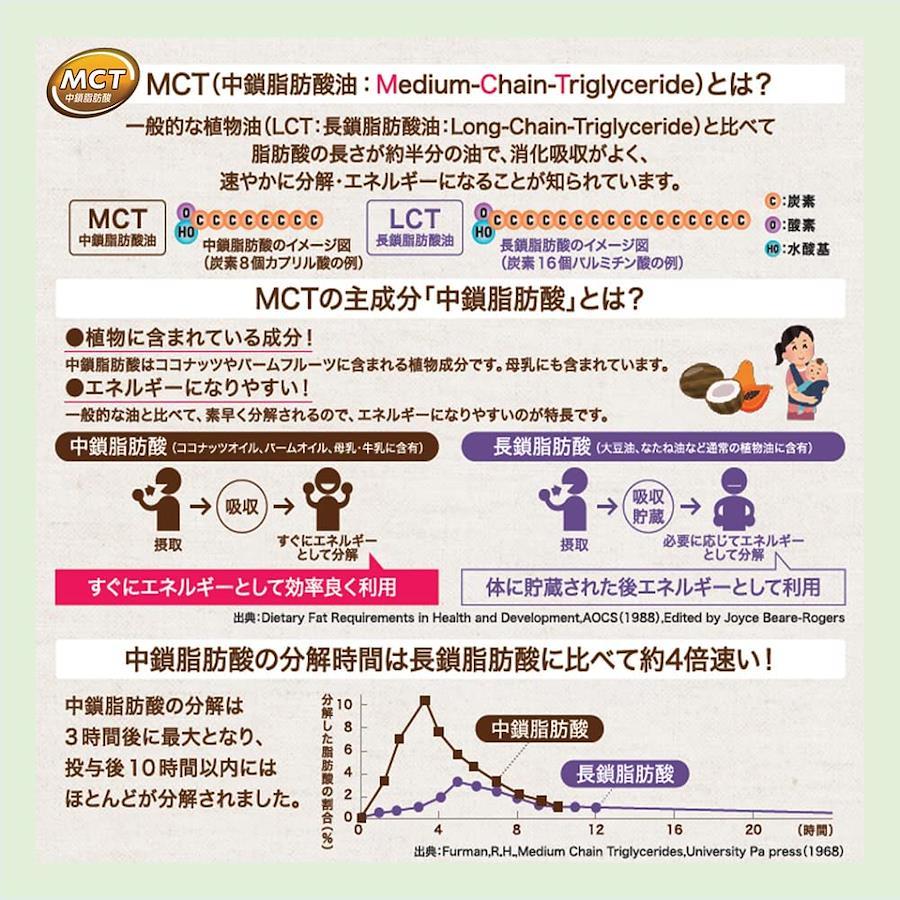 一般的な植物油と比べて、消化吸収がよく、エネルギーになりやすいのが特徴です。