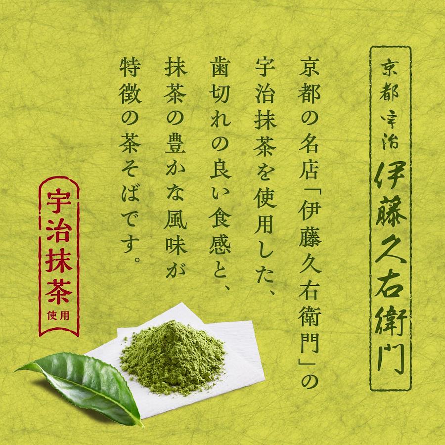 京都の名店「伊藤久右衛門」の宇治抹茶を使用した、歯切れの良い食感と、抹茶の豊かな風味が特徴の茶そばです。「伊藤久右衛門」とは、品質にこだわり丁寧に仕上げた、宇治茶ならではの美しい色・豊かな香り・味わいを発信しつづけているお茶屋です。抹茶の豊かな風味と茶そばならではの色合いをご家庭でお楽しみください。