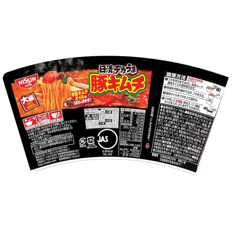 一杯食べた後の満足感が他とは違う!お手頃価格の大盛サイズ!ポークベースのスープにキムチのクセになる味わいが特長の辛旨キムチオイルがうまさの決め手!の豚キムチラーメン。麺はスープ絡みの良さと噛み応えを追求した中太ちぢれ麺。大盛り麺90g90gで食べ応え抜群です。(101g当たり)エネルギー:472kcal、たんぱく質:10.2g、脂質:20.3g、炭水化物:62g、食塩相当量:6.5g、ビタミンB1:0.27mg、ビタミンB2:0.35mg、カルシウム:132mg