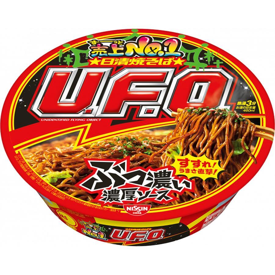 商品名のU.F.O.は商品特長である「うまいソース(うまい=U)、太い麺(ふとい=F)、大きいキャベツ(大きい=O)」を表しています。
