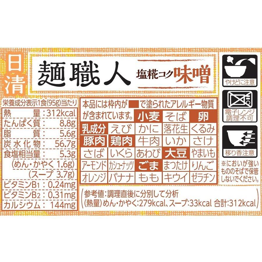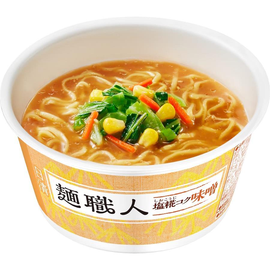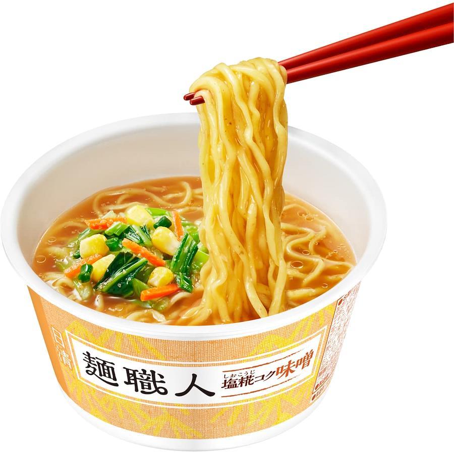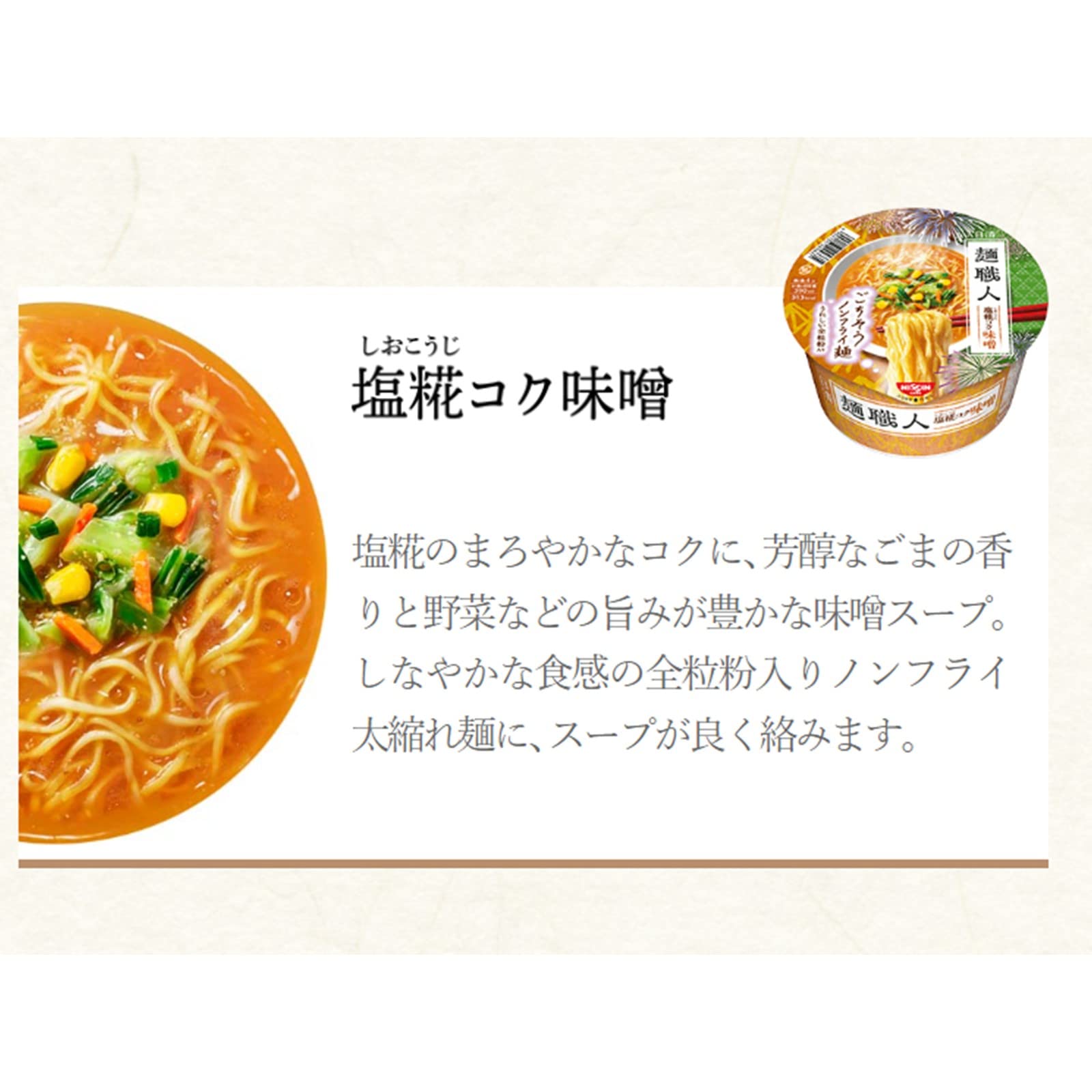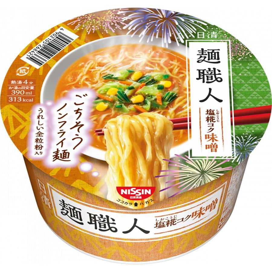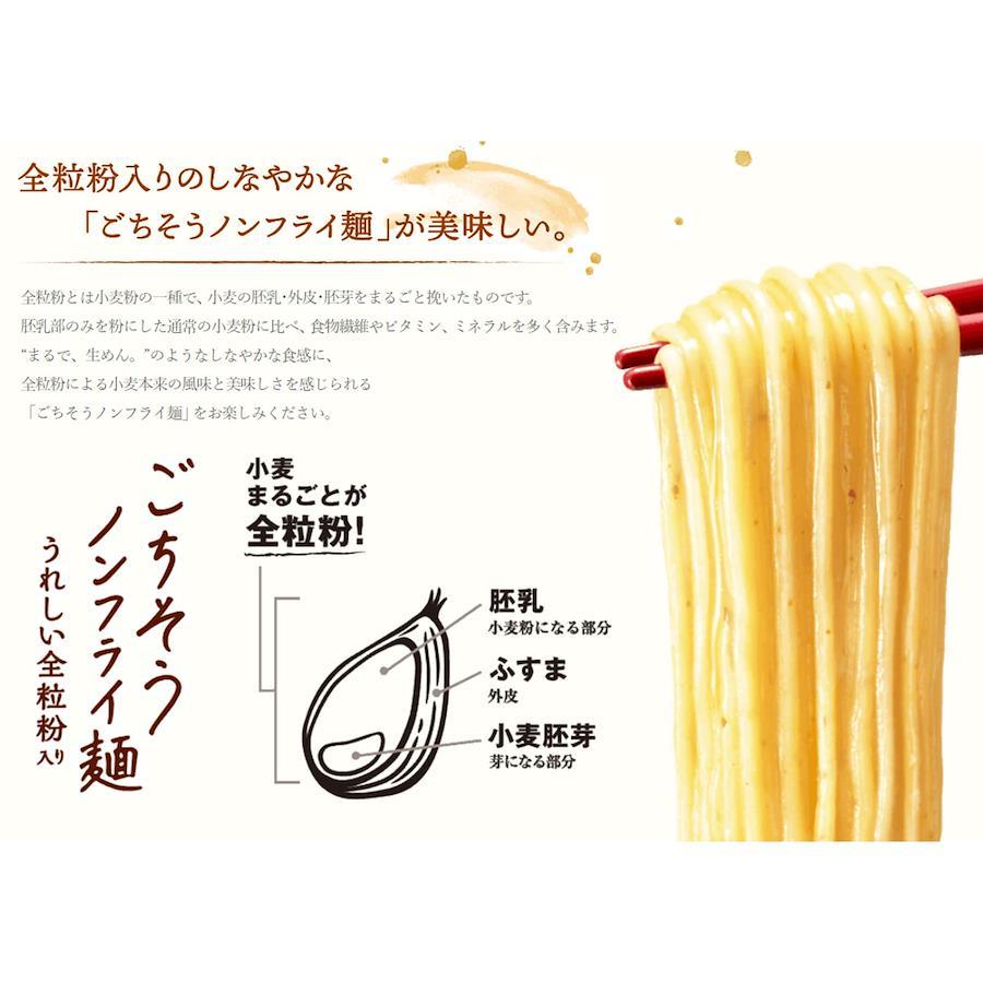 ごちそうノンフライ麺 “塩糀でまろやかなコクUP"で、さらに美味しく!旨み豊かな味噌スープが、全粒粉入りのごちそうノンフライ麺に良く絡みます。具材はキャベツ、すりごま、チンゲン菜、コーン、ニンジン、ネギ。