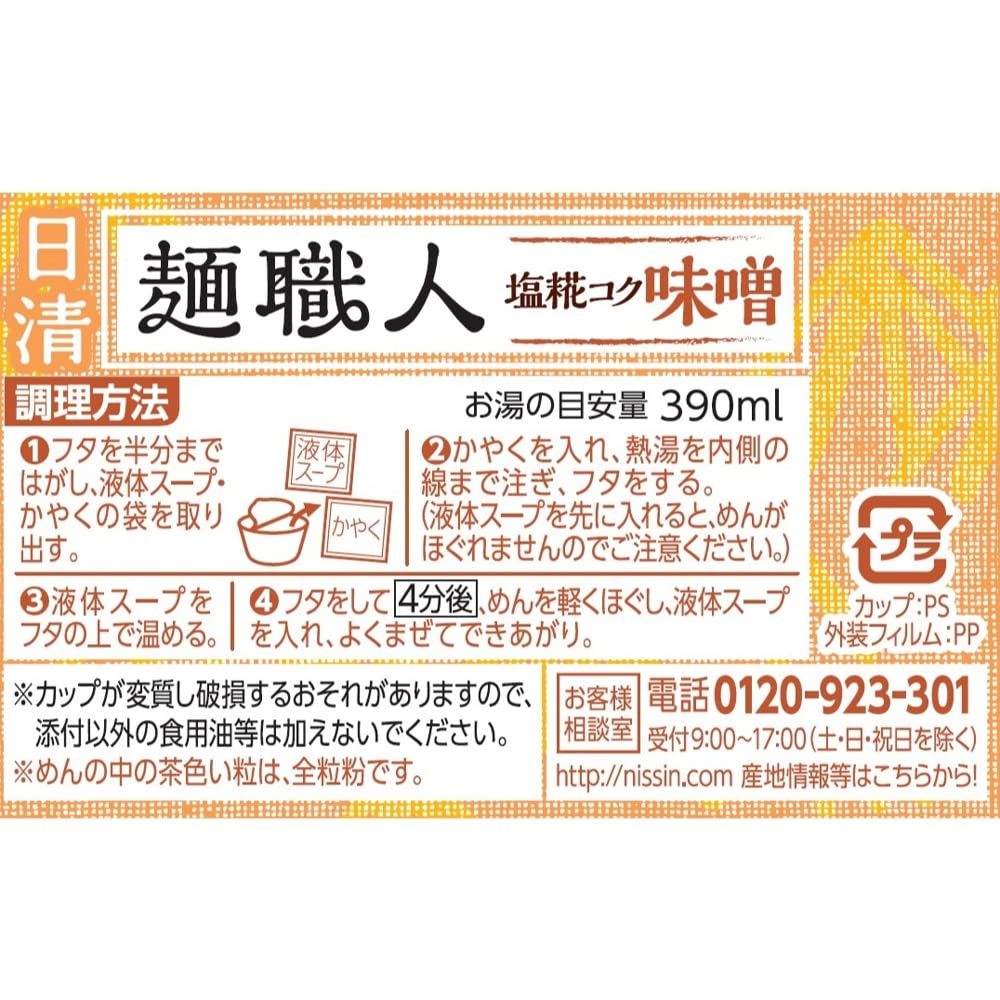 【1】フタを半分まではがし、液体スープ・かやくの袋を取り出す。【2】かやくを入れ、熱湯を内側の線まで注ぎ、フタをする。 (液体スープを先に入れると、めんがほぐれませんのでご注意ください。)【3】液体スープをフタの上で温める。【4】フタをして4分後、めんを軽くほぐし、液体スープを入れ、よくまぜてできあがり。