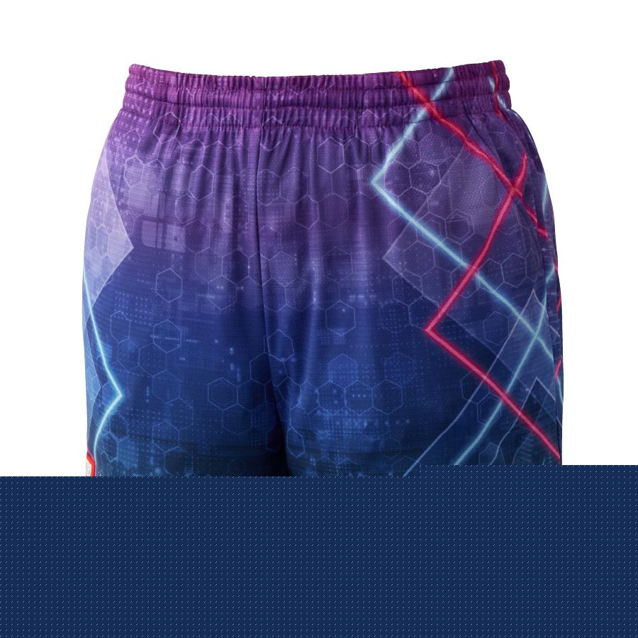 近未来を想像させるネオンサイン×サイバー風デザインには、自分の思い描いた姿になれるように!という想いを込めました。発色性がよく、光沢感のあるブライトドット素材を採用。サラっとした肌触りと伸縮性もあり、着心地抜群です。ラウンドタイプの裾でスマート見え効果!