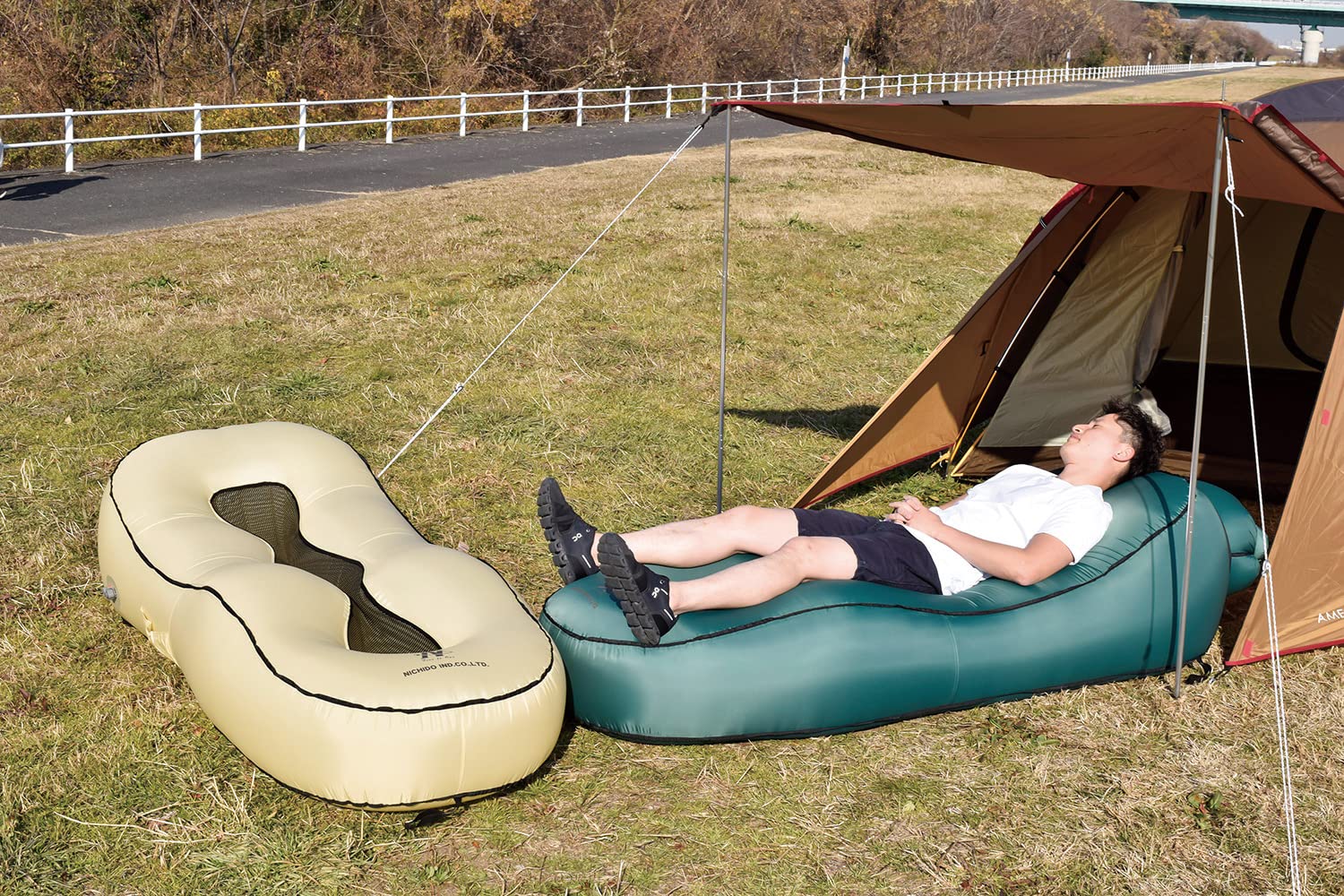 【特徴】・押すだけで膨らむエアポンプ内蔵のため自動で膨らみ、大きな空気排出口でエア抜きもあっという間・エア部分は丈夫なパラシュート素材、中央は通気性バツグンのメッシュ素材で快適に過ごせる・USB充電ポート付きでスマホを見ながらくつろげ、収納もできるポケット付き・付属のペグで3点固定できるため、風が吹いても安心