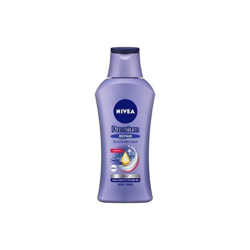 【ニベア プレミアムボディミルク リペアの商品詳細】●粉ふきや乾燥を防ぎ、上質なつやのあるすこやかな肌が一日続く薬用高保湿ミルク。●【販売名】ニベア薬用エクストラリペアボディミルク【使用方法】適量を首筋・腕・足などの全身にお使いください。【成分】グリチルリチン酸ジカリウム*、水、グリセリン、ワセリン、ジメチコン、スクワラン、トレハロース、POE(9)ラウリルエーテル、飽和脂肪酸グリセリル、セレシン、イソステアリン酸コレステリル、ヘキサデシロキシPGヒドロキシエチルヘキサデカナミド、吸着精製ラノリン、レモングラス抽出液、BG、アクリル酸・メタクリル酸アルキル共重合体、カルボキシビニルポリマー、水酸化ナトリウム液、フェノキシエタノール、パラベン*は「有効成分」無表示は「その他の成分」【注意事項】・傷、はれもの、湿疹等異常のあるところには使わない。・肌に異常が生じていないかよく注意して使う。肌に合わない時や、使用中、赤み、はれ、かゆみ、刺激、色抜け(白斑等)や黒ずみ等の異常が出た時、また日光があたって同じような異常が出た時は使用を中止し、皮フ科医へ相談する。使い続けると症状が悪化することがある。・目に入った時は、すぐに充分洗い流す。・子供や認知症の方などの誤飲等を防ぐため、置き場所に注意する。【原産国】日本