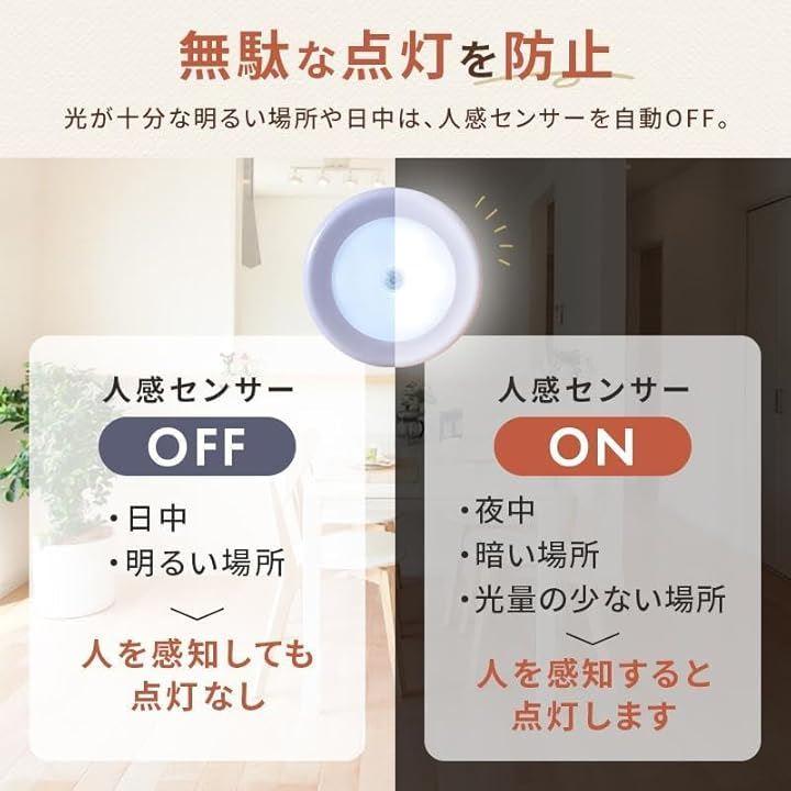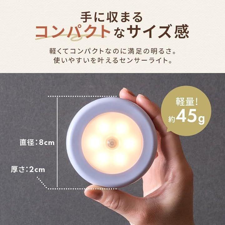 「商品仕様」 サイズ:約直径8cmx厚さ2cm/搭載LED:6灯/動作:人感センサー*周囲が暗い場合のみ。