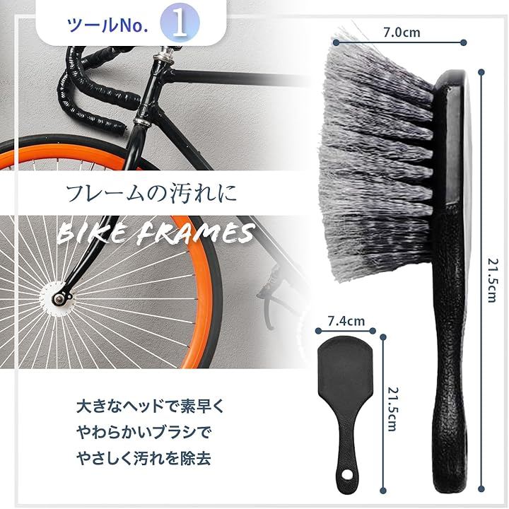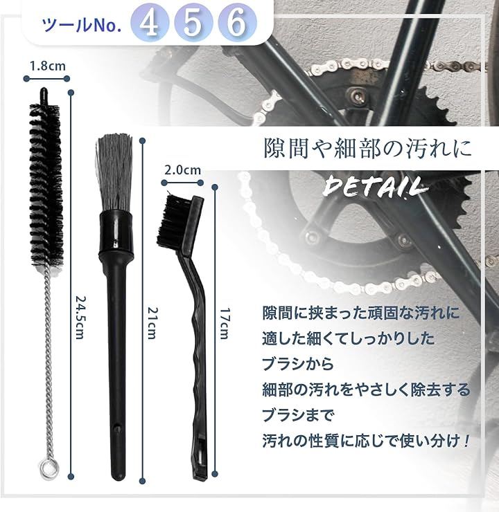 フレーム、ホイール、チェーン、ギア、スポーク、隙間など、パーツごとに使い分けられる専用ブラシが揃っており、洗車初心者でも簡単にプロ級の仕上がりを実現できます。