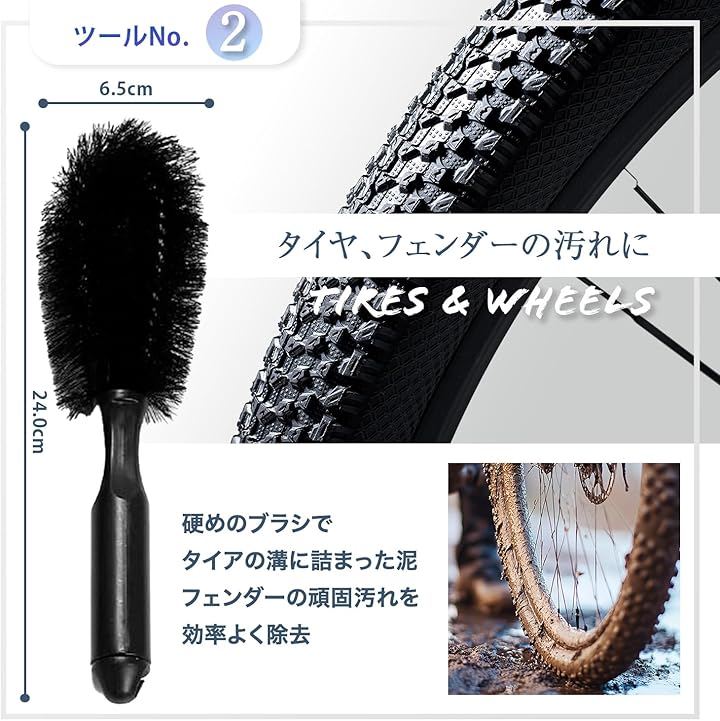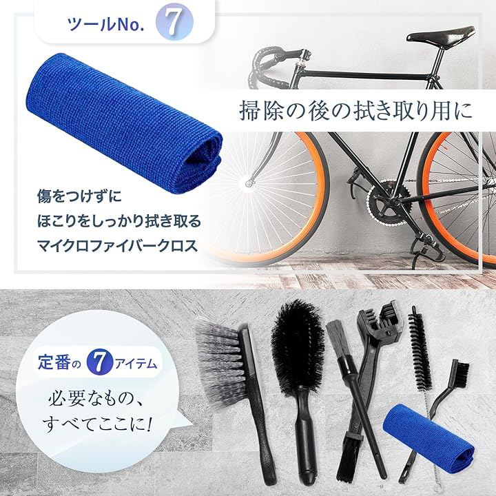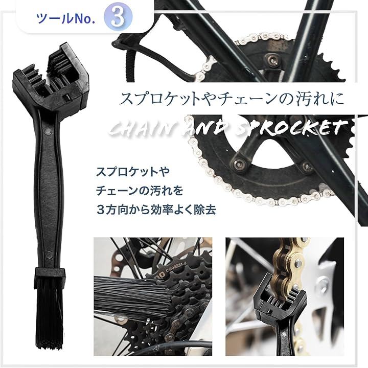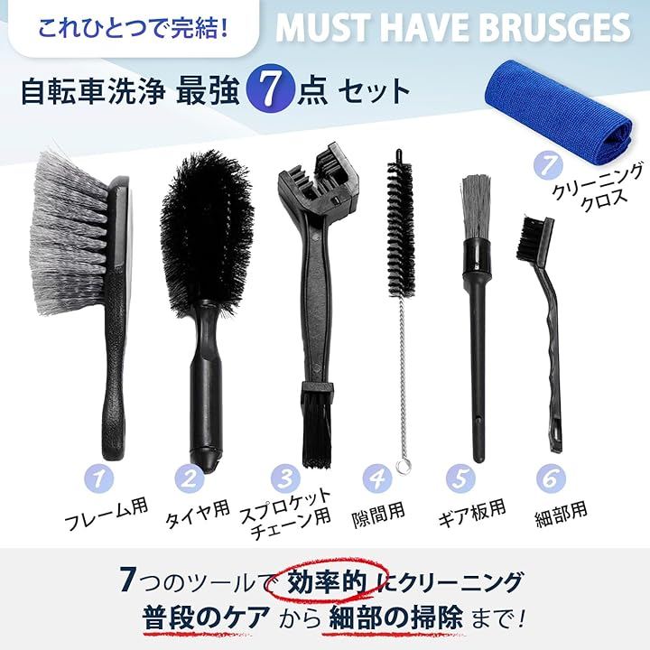 「セット内容」 ・チェーンブラシ ・ホイール/フレームブラシ ・ギア/隙間ブラシ ・スポーク/狭所ブラシ ・クリーニングブラシx2 ・マイクロファイバーウエスx1 「どれを使えばいいかわからない…」という初心者の方でも安心の用途別構成。