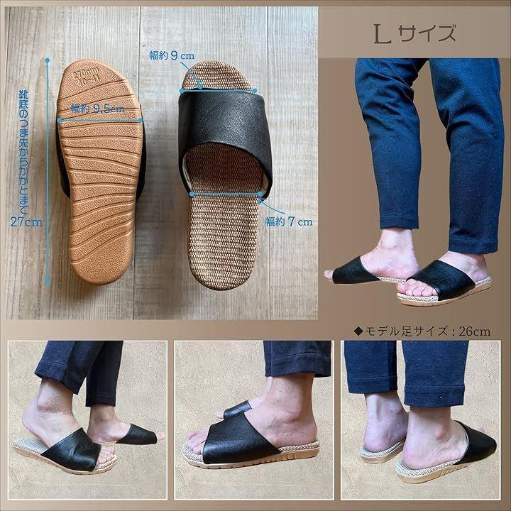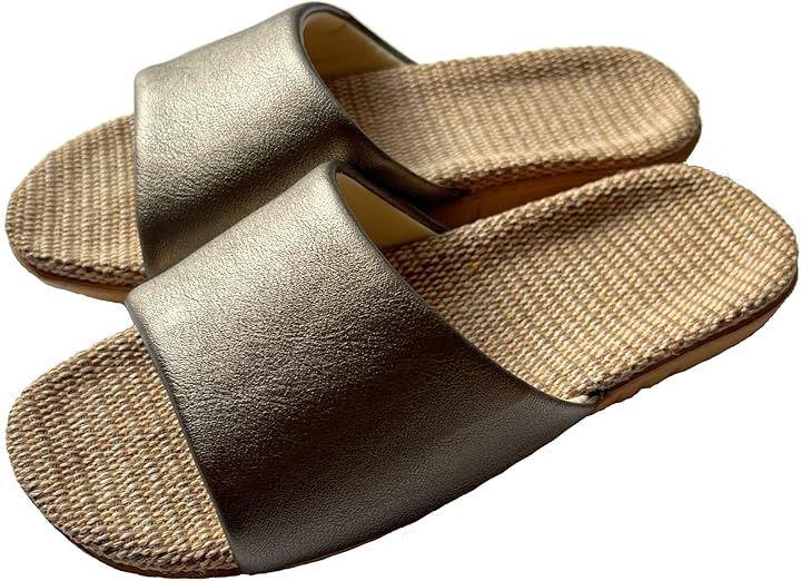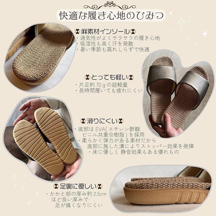 「材質」 インソール:麻 甲材:ポリウレタン 底材:EVA樹脂(エチレン酢酸ビニル共重合樹脂) 「重量」160g 「原産国」中国 *大人カラーのおしゃれスリッパ *快適な履き心地* ・麻素材のインソールは通気性がよくサラサラの履き心地。