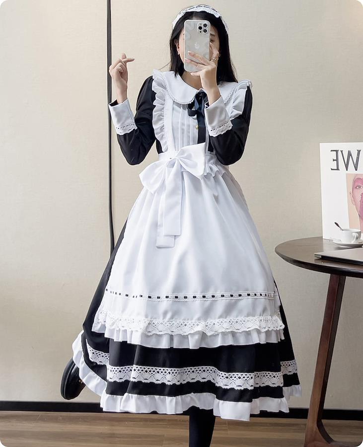 ★【優雅で華麗なメイド服】様々なイベントにてお使い頂ける大人気なメイド服です。礼儀ただしいお嬢様がメイドに変身したような雰囲気がどんどん溢れて来る一着。可愛いくて綺麗なレースが沢山付いた透け感のあるデザインが特徴です♪★【美脚でセクシーなロングドレス】ロングドレスのウエストが高い為、足が長けそうに見える、とっても魅力的な美脚効果があります。ストッキングなど下着と組みとロングメイド服しかできないシークレットで大胆なセクシー雰囲気ができます。★【厳選された上質な素材】:衣装の生地は素材はポリエステル。PETで作られるポリエステル繊維は、軽くて耐久性が高い、速乾性がある、耐候性に優れているといういくつ特徴が持っています。柔らかい生地と心地よい肌触りが、さっぱりしている感じを与えて、脱着もやすいです。耐候性に優れており、長期間外気に触れていても劣化しないため、アウトドア用品にも広く使われています。★【豪華5点セット】:「カチューシャ」+「ワンピース」+「エプロン」+「蝶タイ」+「リボン」★【迅速・丁寧な対応】:こちらでは、お客様の満足度アップのために日々、向上心を持って取り組んで参りたいと思っております。ご利用いただく中でご不明な点や不具合なところなどございましたら、いつでも御遠慮なくお問い合わせくださいませ。至急にご対応いたします。