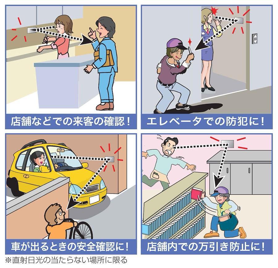 薄型の広角ミラーなので邪魔にならずどこにでも貼れる見える範囲は上下方向約70度、左右方向約90度玄関や入り口での、後方からの訪問者の確認、防犯に! 店舗内での万引き防止に! デスクワーク時の後方からののぞき込み防止に! 死角の確認に!日本製