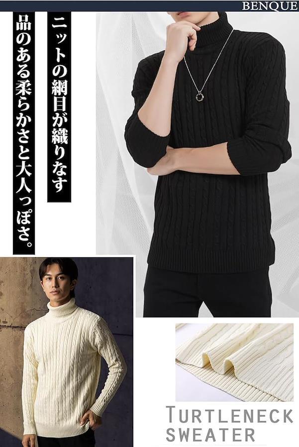 「上品さとスタイリッシュさを兼ね備えた」高いデザイン性とスリムなシルエットが特徴のケーブル編みニットタートルネックセーター。