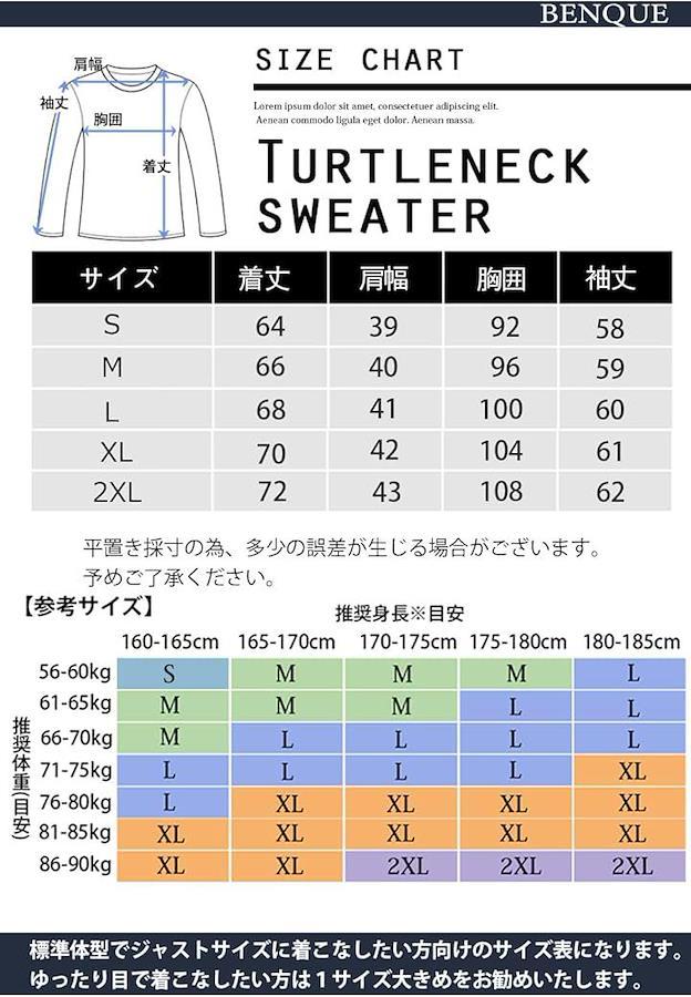 「首元まで温かく、お洒落に」首元を暖かく包み込むタートルネックと、リブ加工の袖口と裾が特徴。