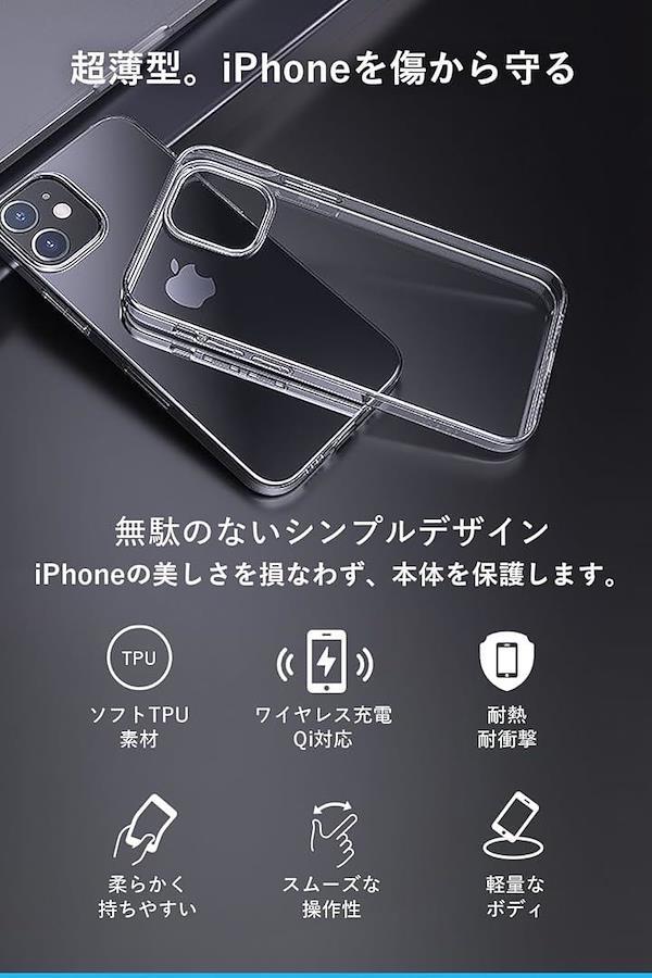 「簡単脱着透明ケース」このケースはソフトタイプのTPUを使用しており、ツルッとした手触りと適度なグリップ感が特徴です。