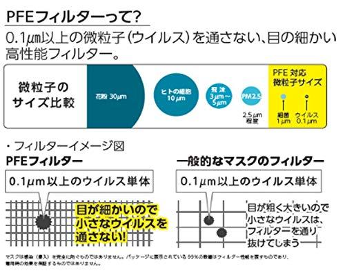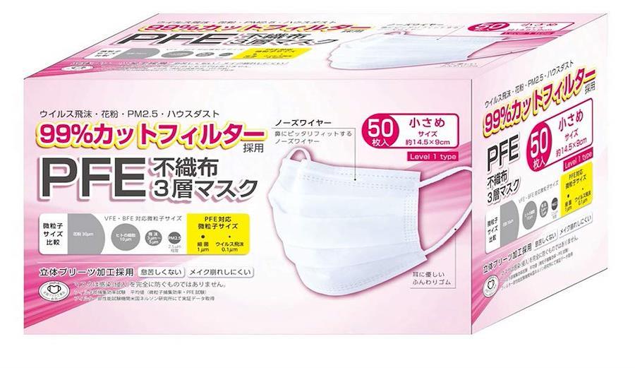 〇商品説明PFEフィルターを採用した不織布3層マスクの50枚入タイプです。PFE、BFE、VFE99%カット オメガプリーツで顔にフィットしやすく耳紐が3mm平ゴムで耳が痛くなりづらいです。全国マスク工業会会員です。145mm×95mmの小さめサイズとなります。
