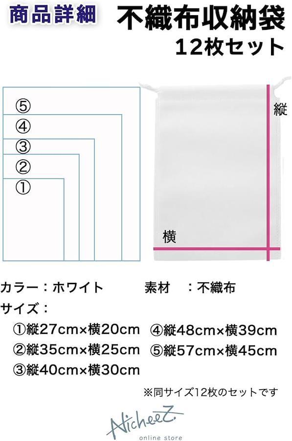 「商品内容」不織布収納袋 セット数:12枚 *同サイズのセットです 素材:不織布 カラー:ホワイト サイズ:サイズ:27cmx20cm , 35cmx25cm , 40cmx30cm , 48cmx39cm , 57cmx45cm