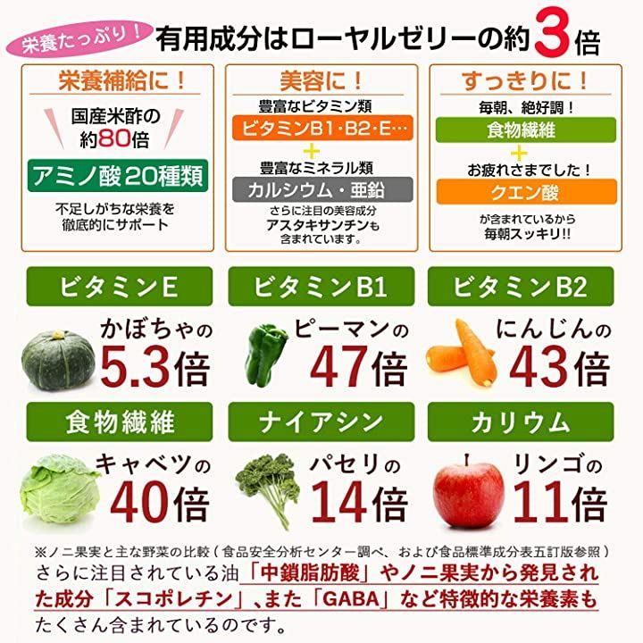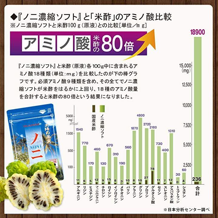 「豊富なアミノ酸」「ノニ濃縮ソフト」には、必須アミノ酸を含めたアミノ酸が、含有量の多いことで知られる米酢の80倍も含まれています。