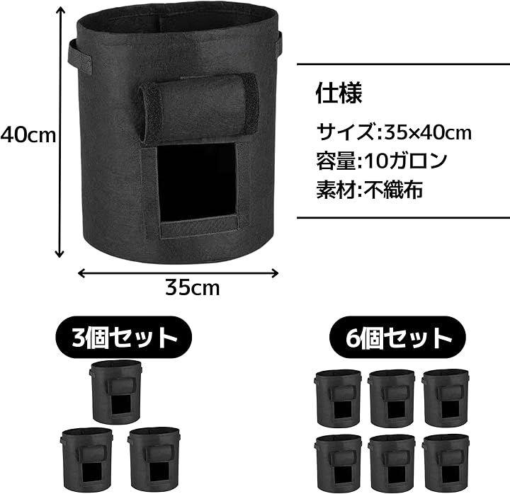 「仕様」サイズ:40x35cm、容量:10ガロン(約40L)、素材:不織布、カラー:ブラック、個数:3個/6個セット