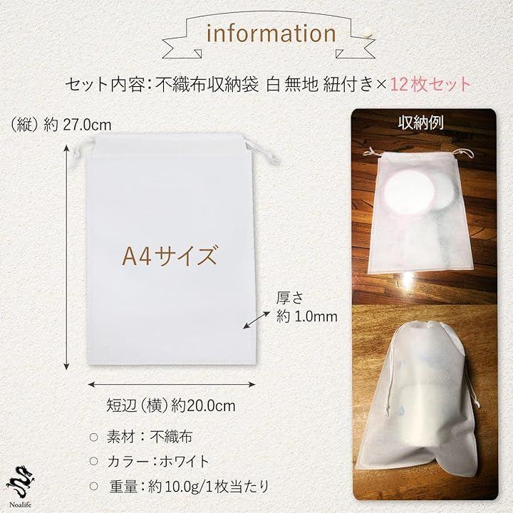 「商品仕様」セット内容:不織布収納袋 巾着袋 白 無地 紐付きx12枚セット サイズ(外寸):長辺(縦) 約27.0cm , 短辺(横) 約20.0cm 厚さ 約1.0mm 重量:約10.0g/1枚当たり 素材:不織布 カラー:ホワイト *モニターの環境等により、色の見え方に若干差が生じる場合がございます。
