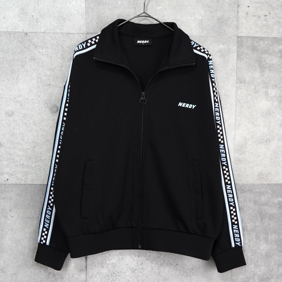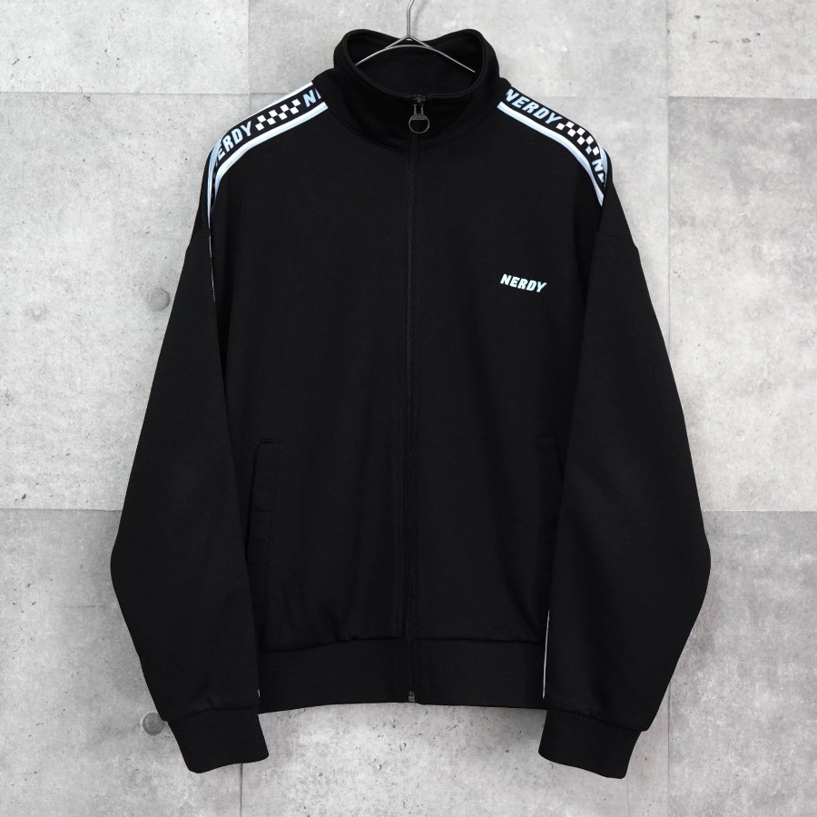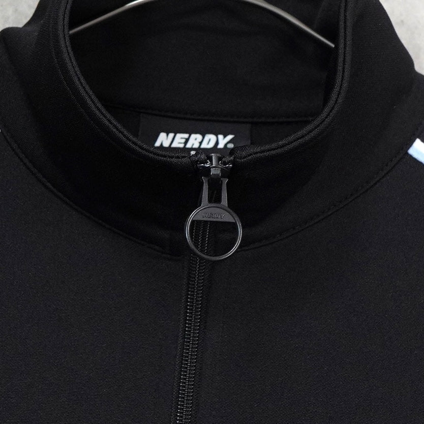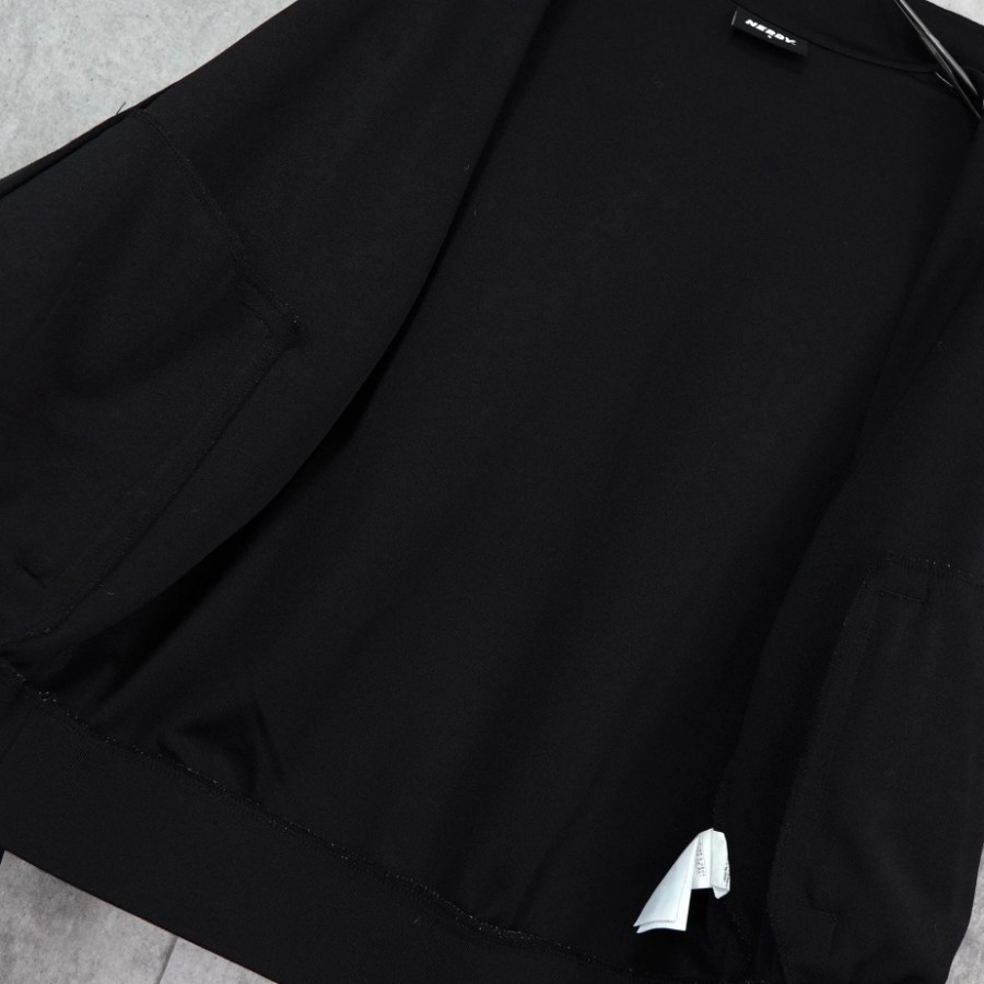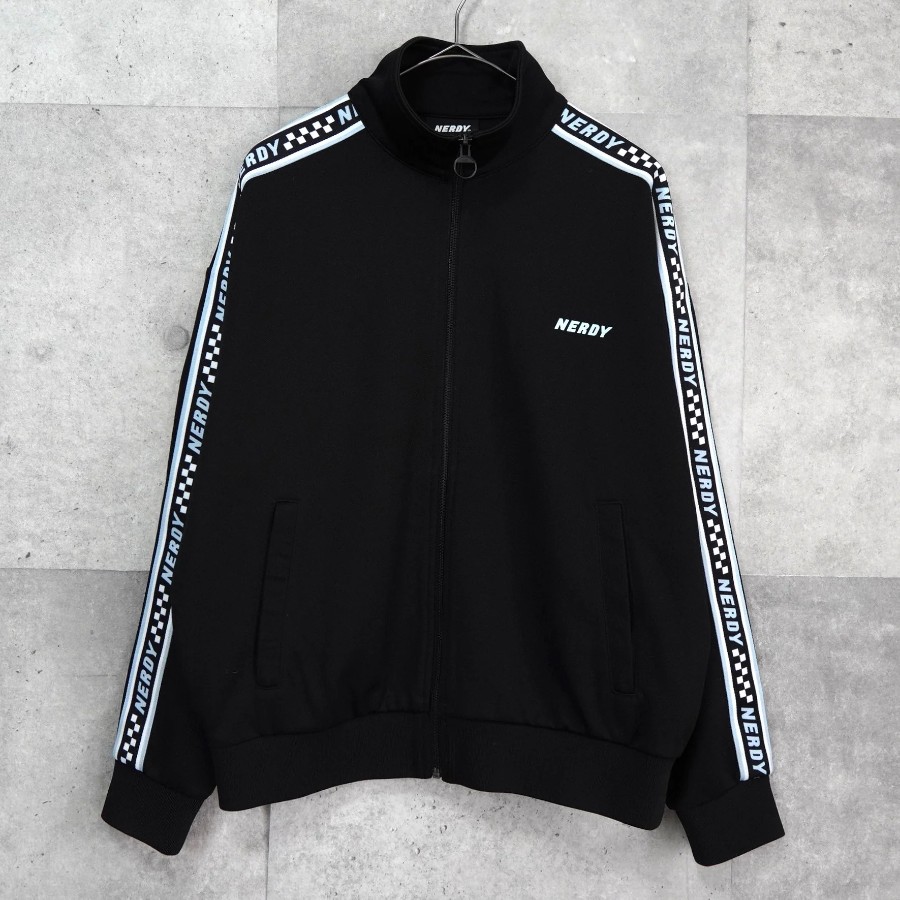 ノルディ ロゴ ショート丈 トラックジャケット ブラック | Brand: NERDY | Category: Jacket / Outerwear | Color: Black | Material: ポリエステル100% | Condition: Good | Condition Notes: フロントに薄汚れ、背面袖部分にいくつかの小さな穴がみられます。(タグより後の写真参照) | Size: 表記サイズ:S 目安サイズ:メンズM / レディースL 程度 ※あくまで目安ですので参考程度でお考えください 肩幅:約61cm 身幅:約59cm 着丈:約62.5cm 袖丈:約52.5cm